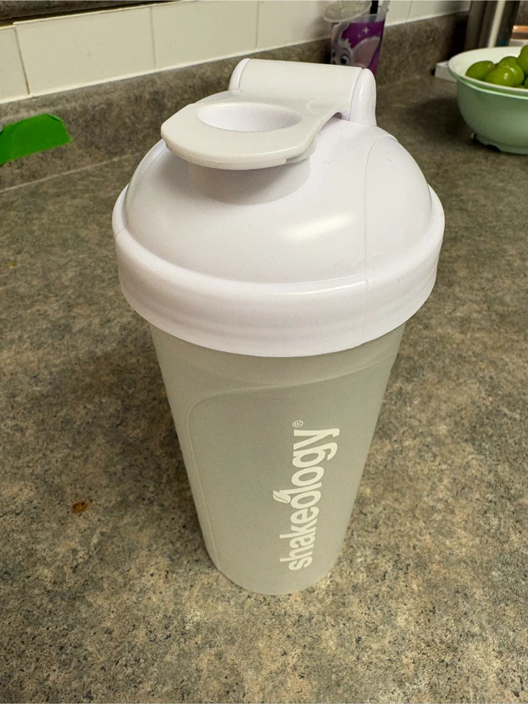 This is a Shakeology shaker bottle. It's white and grey, perfect for mixing your favourite protein shakes and smoothies. It has a secure lid for on-the-go use.