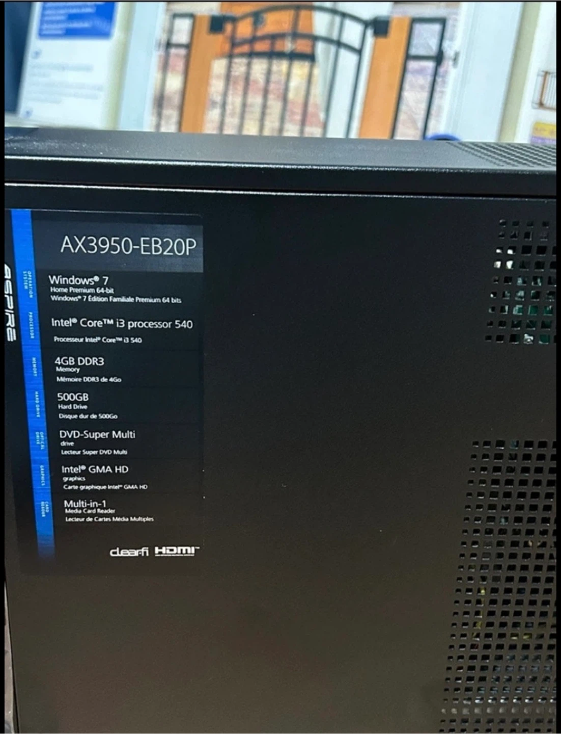 Acer Aspire desktop computer. It's running Windows 7 and has an Intel Core i3 processor with 4GB RAM and a 500GB hard drive. Comes with a DVD-Super Multi drive and built-in media card reader. Includes keyboard, mouse, and monitor.
