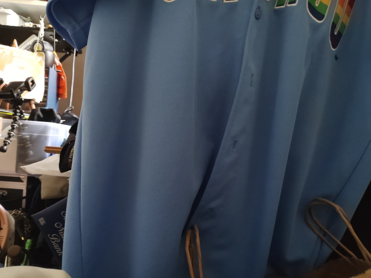 Light blue Chicago Cubs jersey with rainbow "Chicago" lettering across the chest. Features a Cubs logo patch on the sleeve. Polyester fabric.