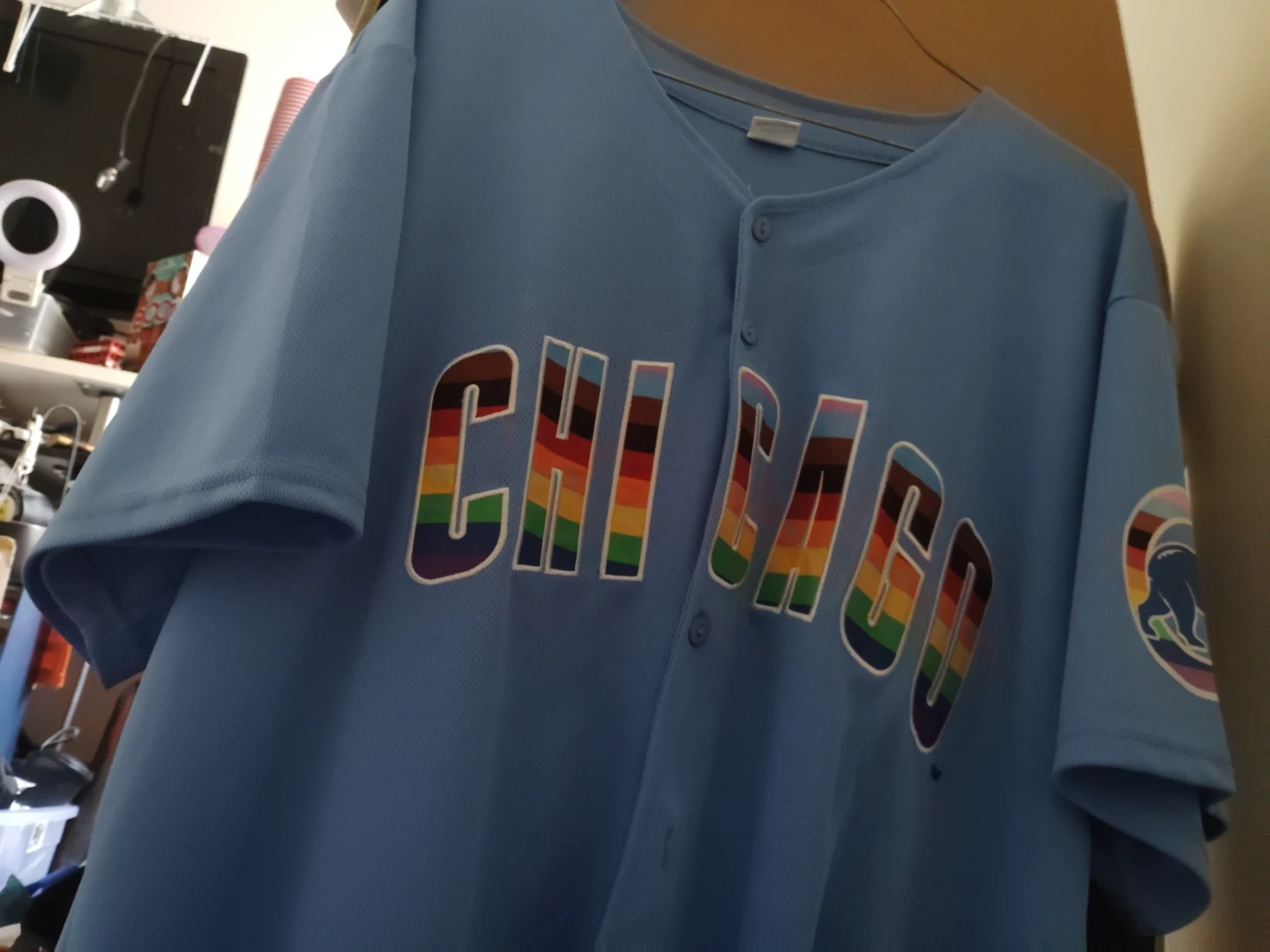 Light blue Chicago Cubs jersey with rainbow "Chicago" lettering across the chest. Features a Cubs logo patch on the sleeve. Polyester fabric.