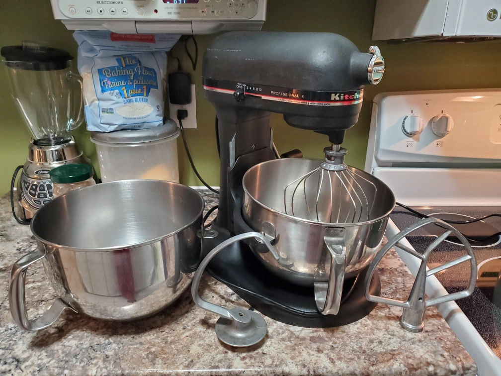 Black KitchenAid Professional 6 (aka 600) stand mixer. Includes 2 metal bowls, and three attachments: whisk, paddle, and dough hook.