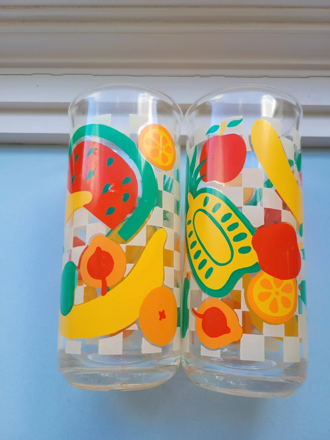 Add a splash of vintage charm to your kitchen with this set of two Culver Taiwan fruit-themed glasses! These glasses feature a delightful checkerboard pattern with vibrant fruit designs, perfect for adding a retro touch to your drinkware collection.