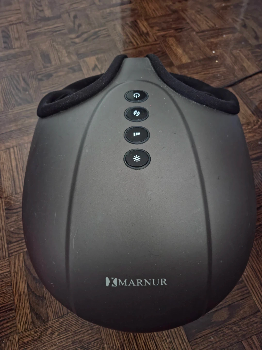 This Marnur shiatsu foot massager offers deep kneading and heat. It has multiple intensity settings and a power button. The inner lining is removable for cleaning.