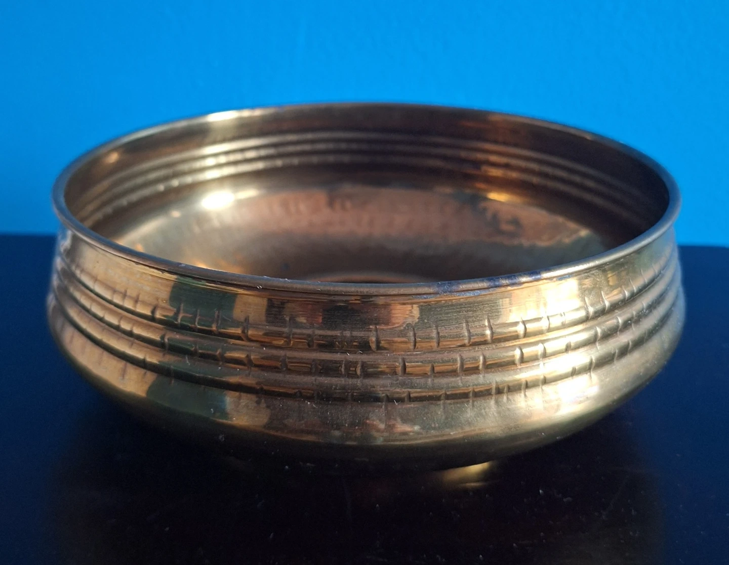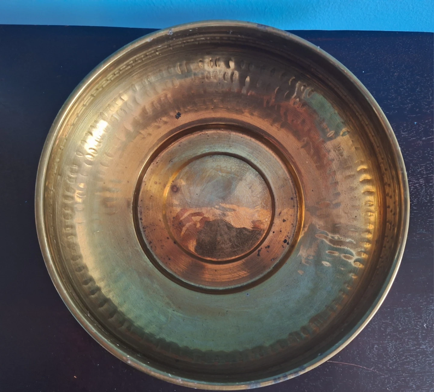This is vintage decorative brass bowl, planter, possibly uruli. It has a hammered finish and ridged detailing on the outside. Diameter is approximately 9 inches, height 3.5 inches