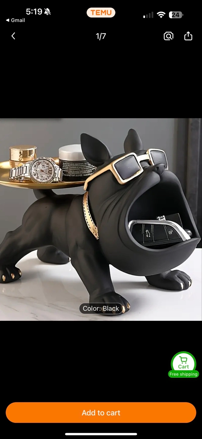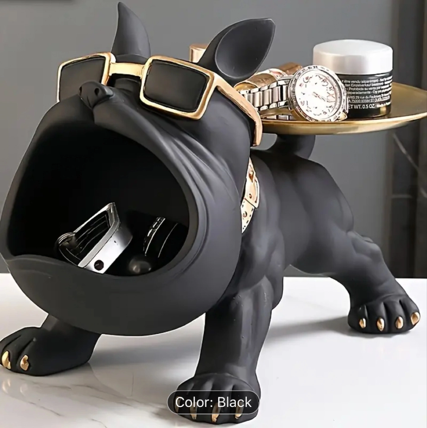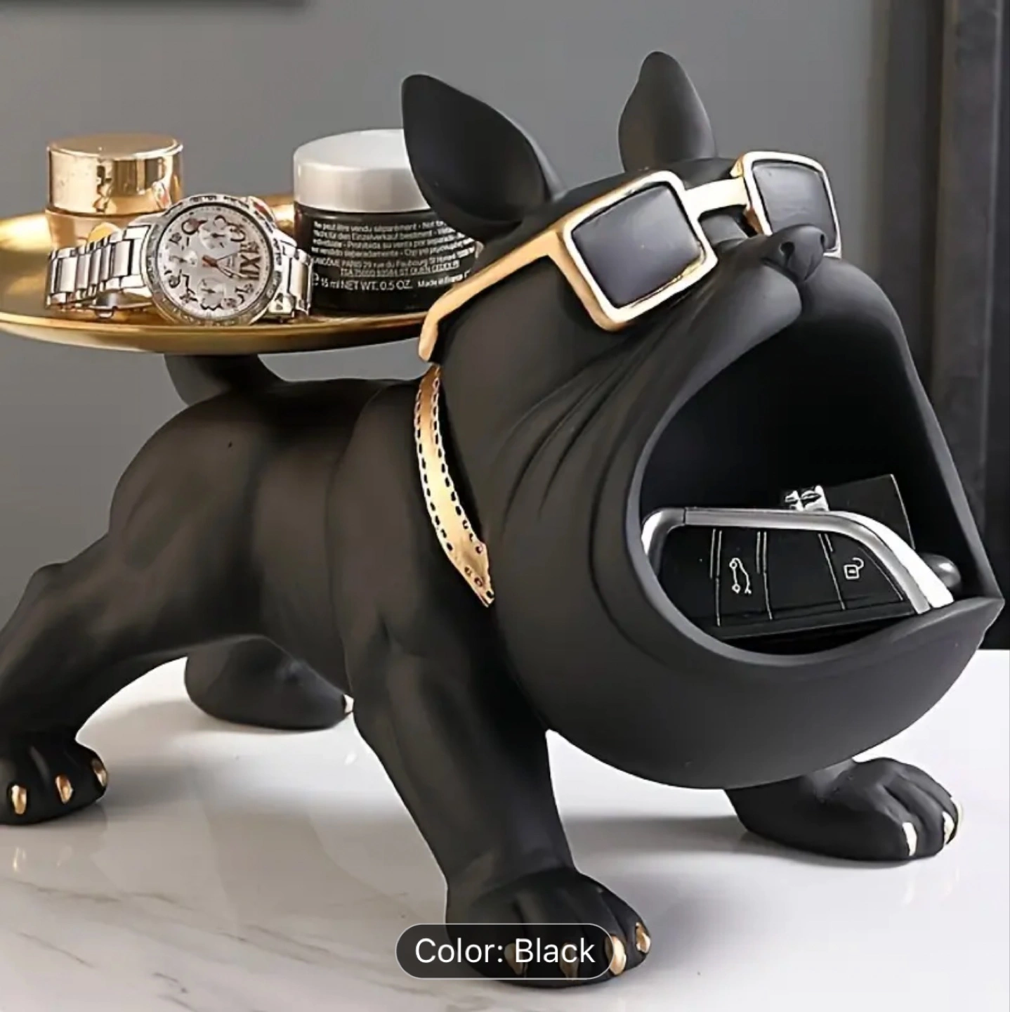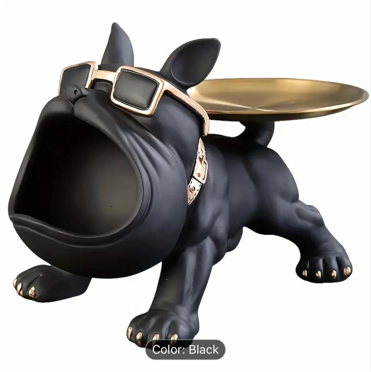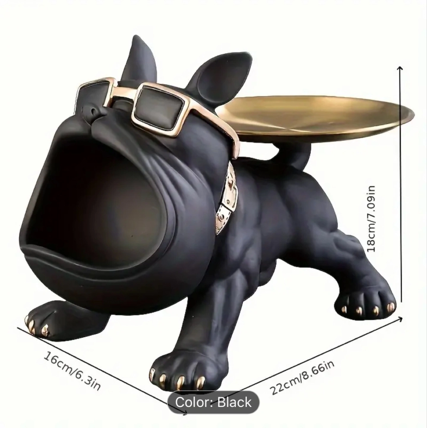 Black French Bulldog shaped resin organizer. Features a tray and open mouth for storage. Gold accents. Great for keys, jewellery, or other small items.