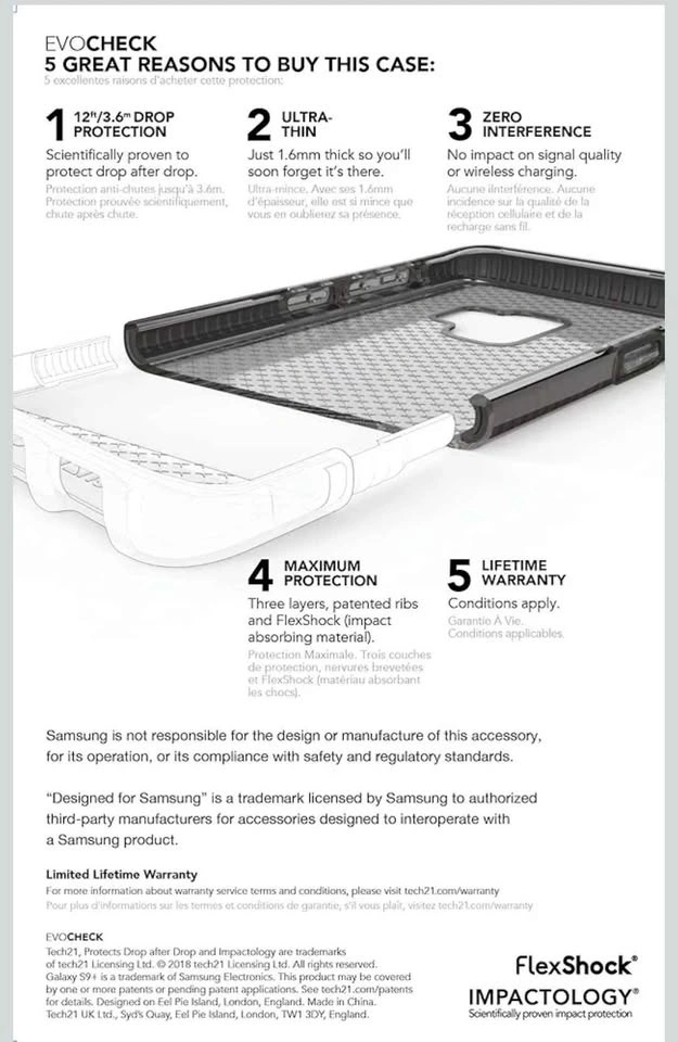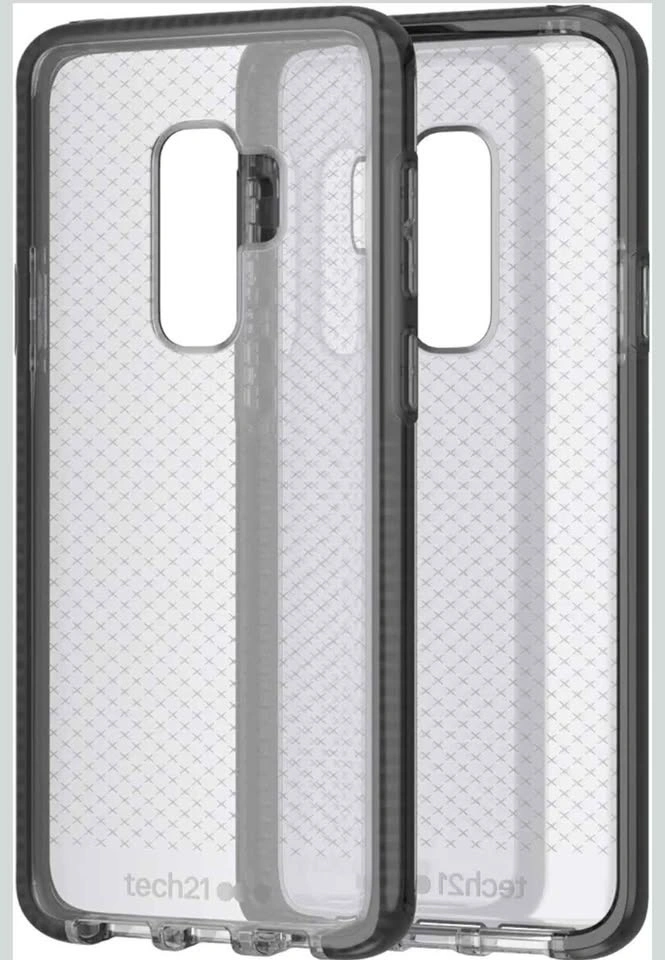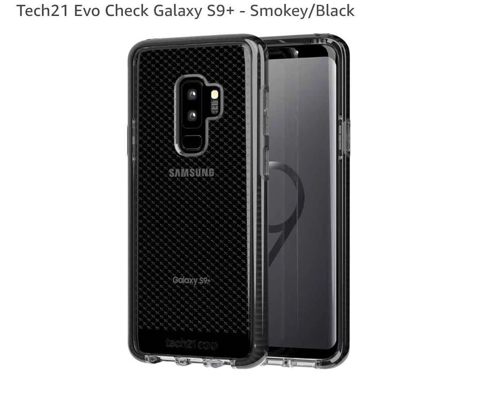 This is a Tech21 Evo Check case for the Samsung Galaxy S9+. It offers excellent protection with its impact-absorbing technology. The color is Smokey/Black.