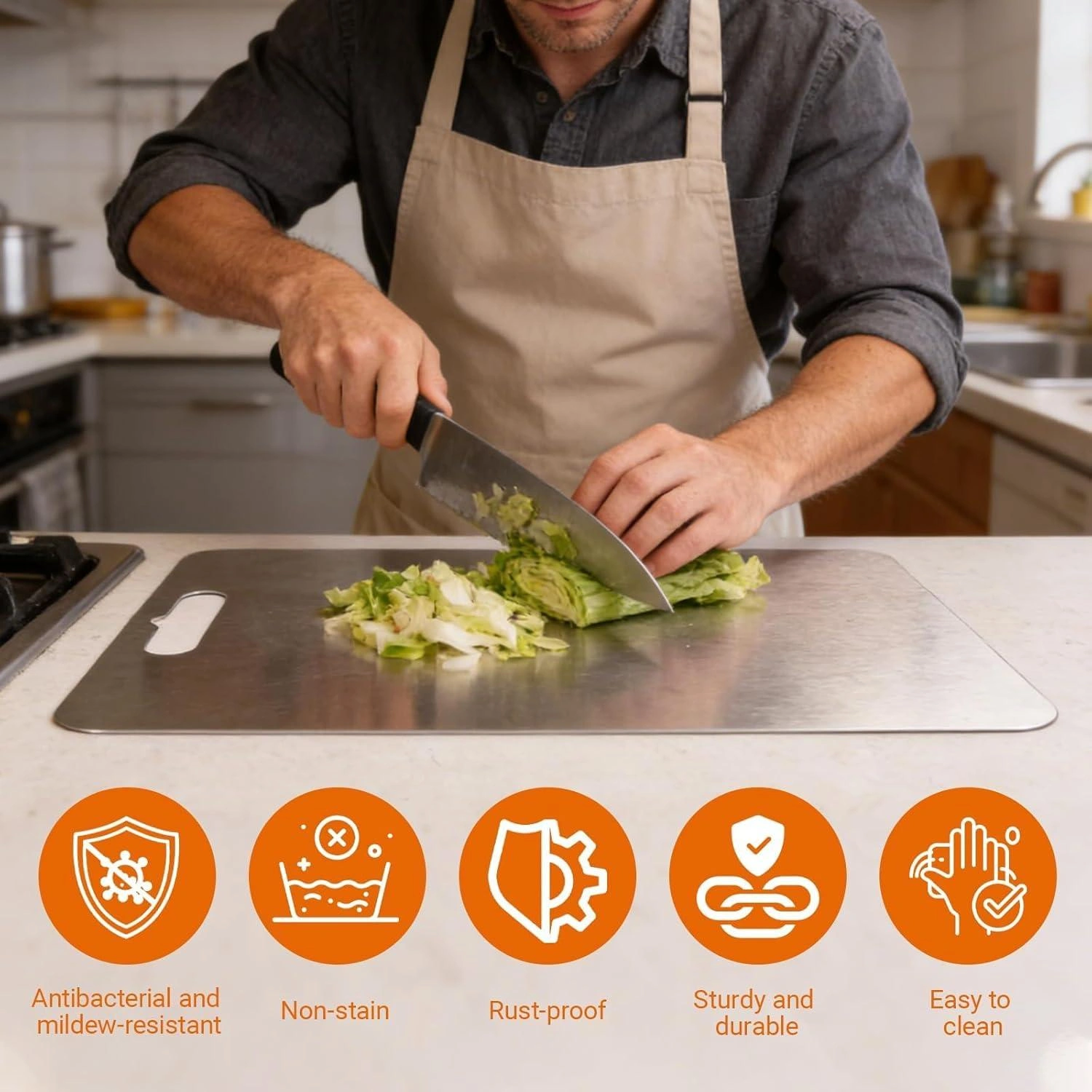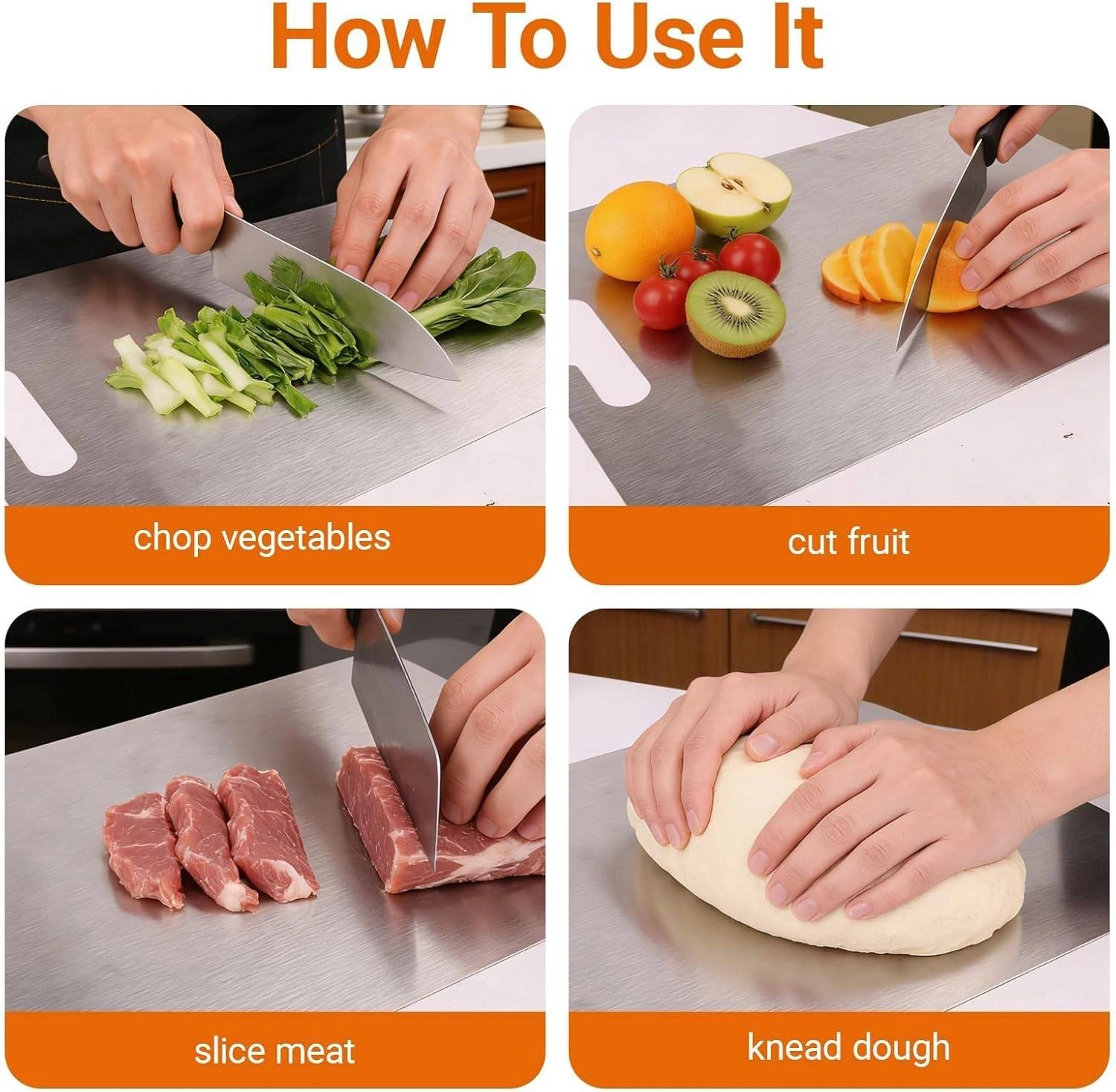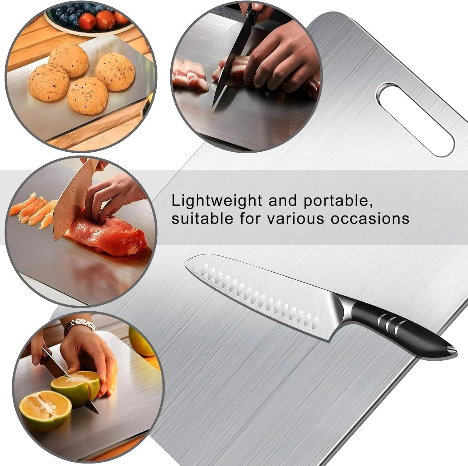 Durable double-sided food-grade 304 stainless steel cutting board – one side for raw meat, the other for fruits & veggies, and perfect for kneading dough without sticking! - Scratch-resistant & long-lasting – stays sleek even with daily use - Anti-bacterial & mildew resistant – provides up to 99% protection - Non-porous surface – prevents odors, stains, and buildup - Easy to clean – simply wipe down with water; lightweight and portable for indoor or outdoor use - Rapid thawing capability – quickly thaws frozen foods - BONUS KNIFE SHARPENER INCLUDED! Retails online for $18+ Priced to move at $14 or best offer Pick up: Riverdale