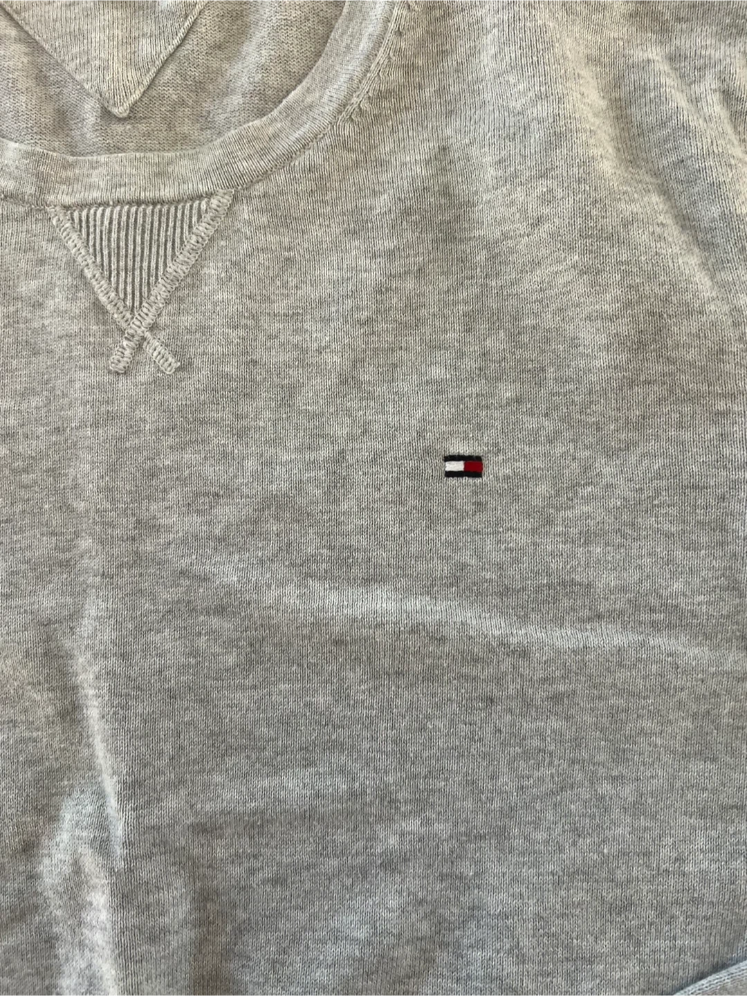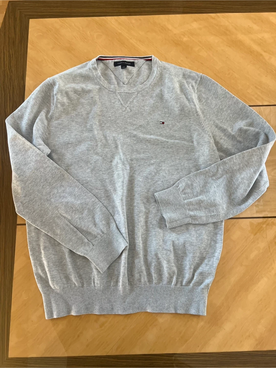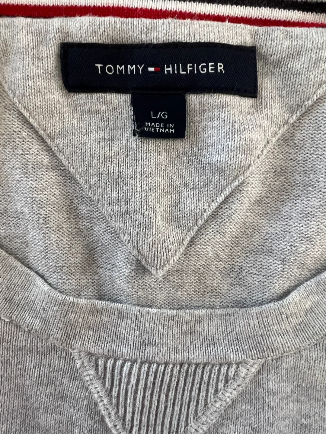Tommy Hilfiger sweater in size L. It's a light gray color and in good condition!