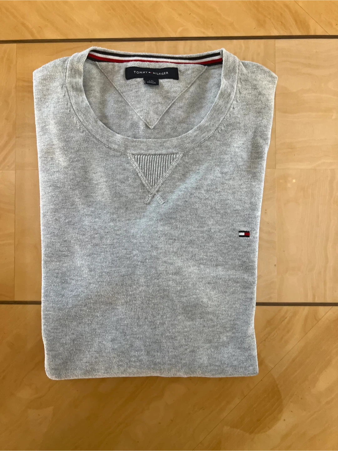 Tommy Hilfiger sweater in size L. It's a light gray color and in good condition!