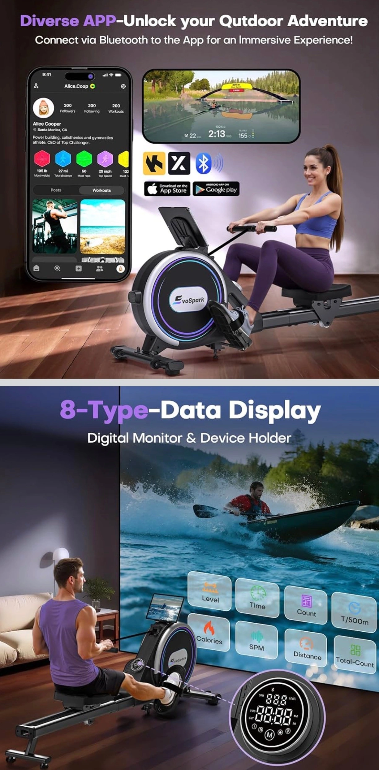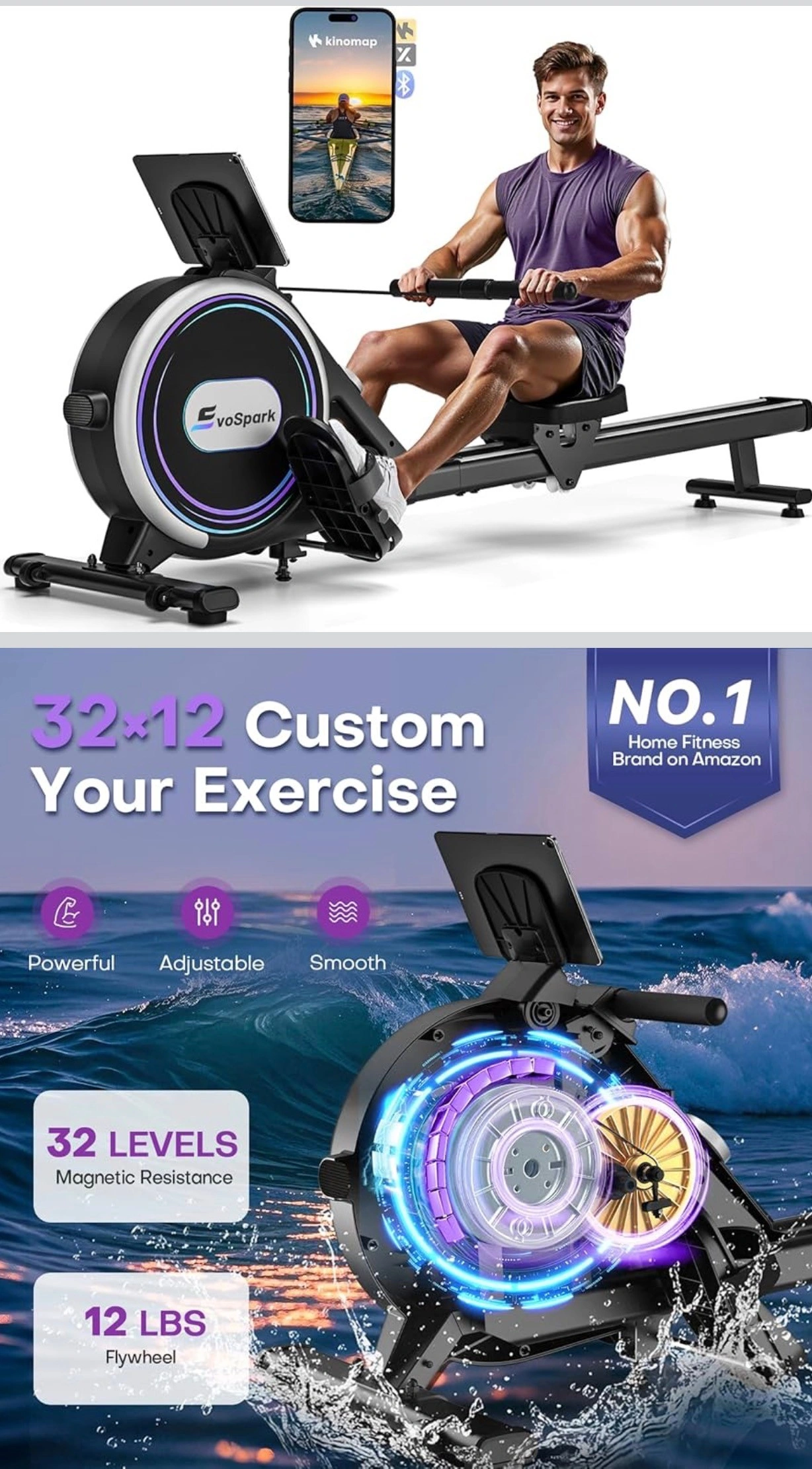 【App Compatible】Connect your smartphone or mobile device to the rowing machine via Bluetooth and receive real-time rowing data! With the popular fitness apps KINOMAP and EXR, you can row on waterways around the world and experience virtual routes – an immersive nature experience right from home! You can also participate in professional rowing training sessions to discover new challenges and improve your physical fitness! Or place your smartphone or iPad on the stand and enjoy other videos or music while using the rowing machine.