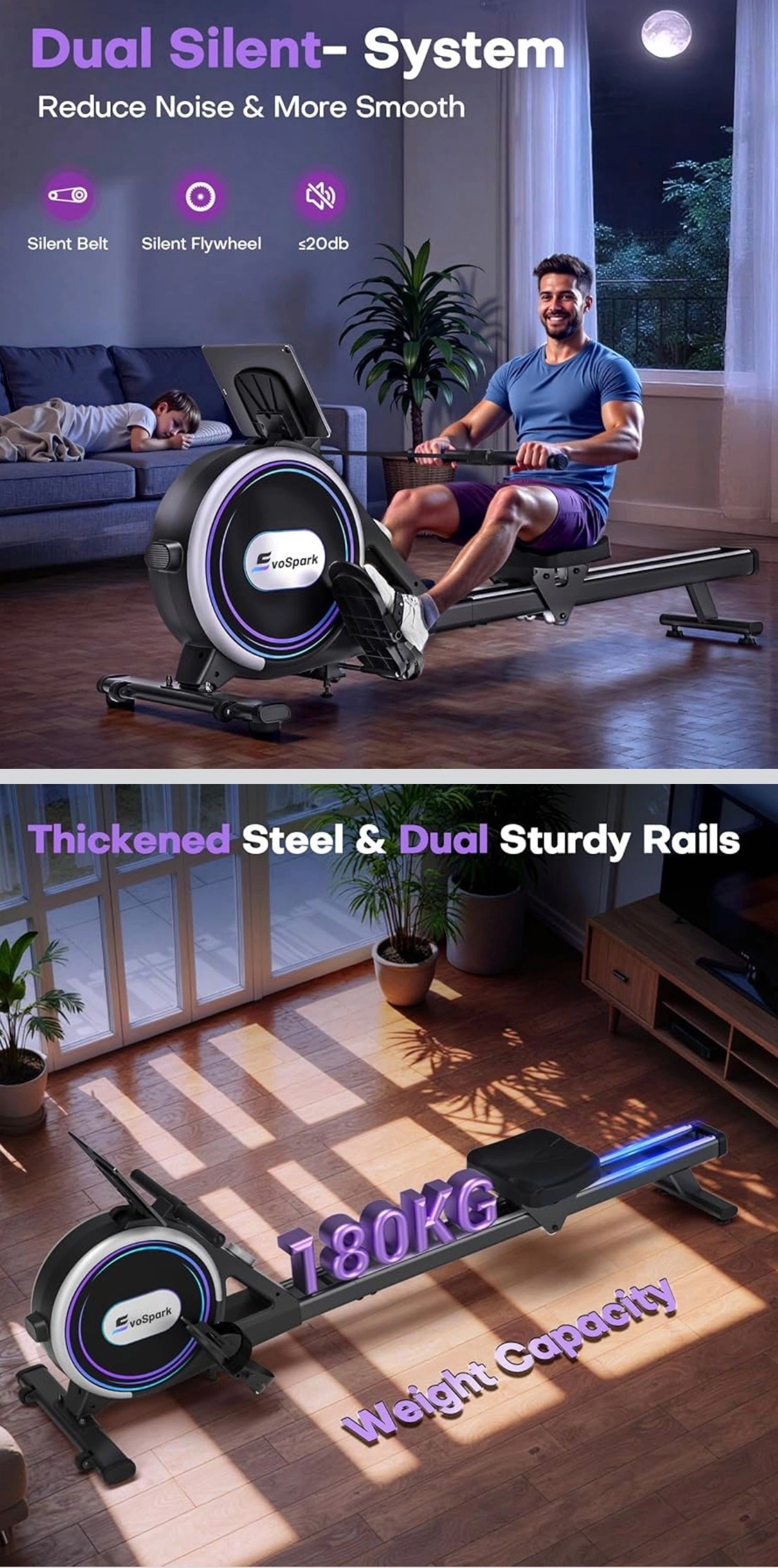 【Double Slide Rail & Ultra-Quiet】We use thickened, commercial-grade steel for this magnetic rowing machine for home use, giving it a better texture and durability that can withstand a maximum load of 180 kg. The magnetic resistance ensures a smooth rowing motion with minimal noise, making it ideal for home use without disturbing other household members.