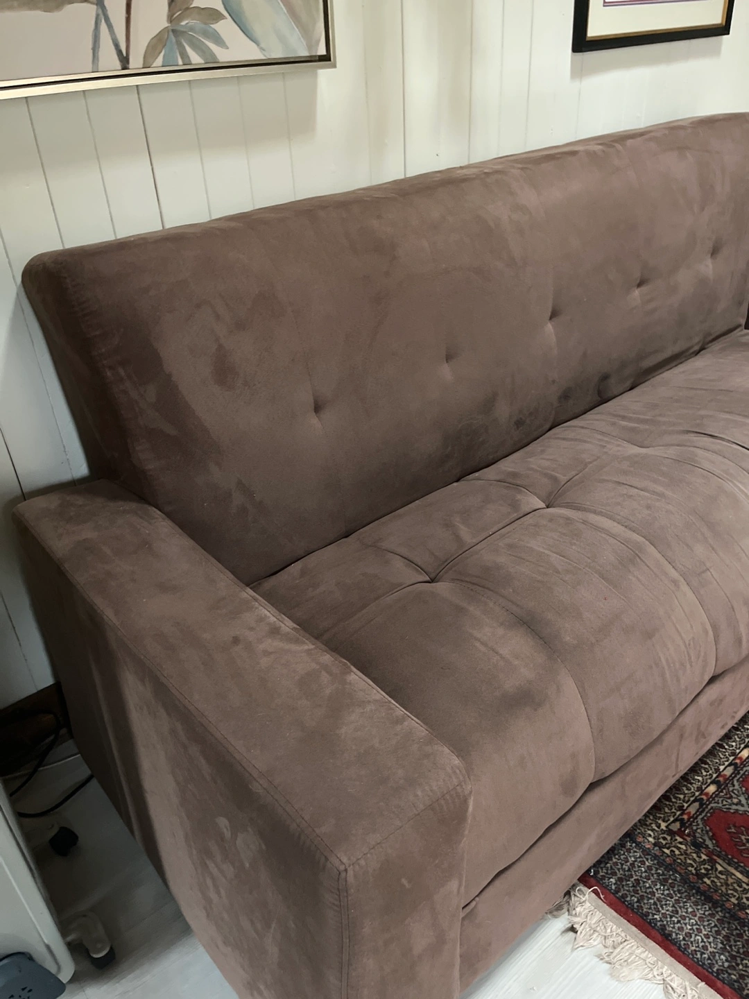 Comfortable brown suede like couch. Clean, modern design. Perfect for apartment or small space. Button tufted details. Minor wear.