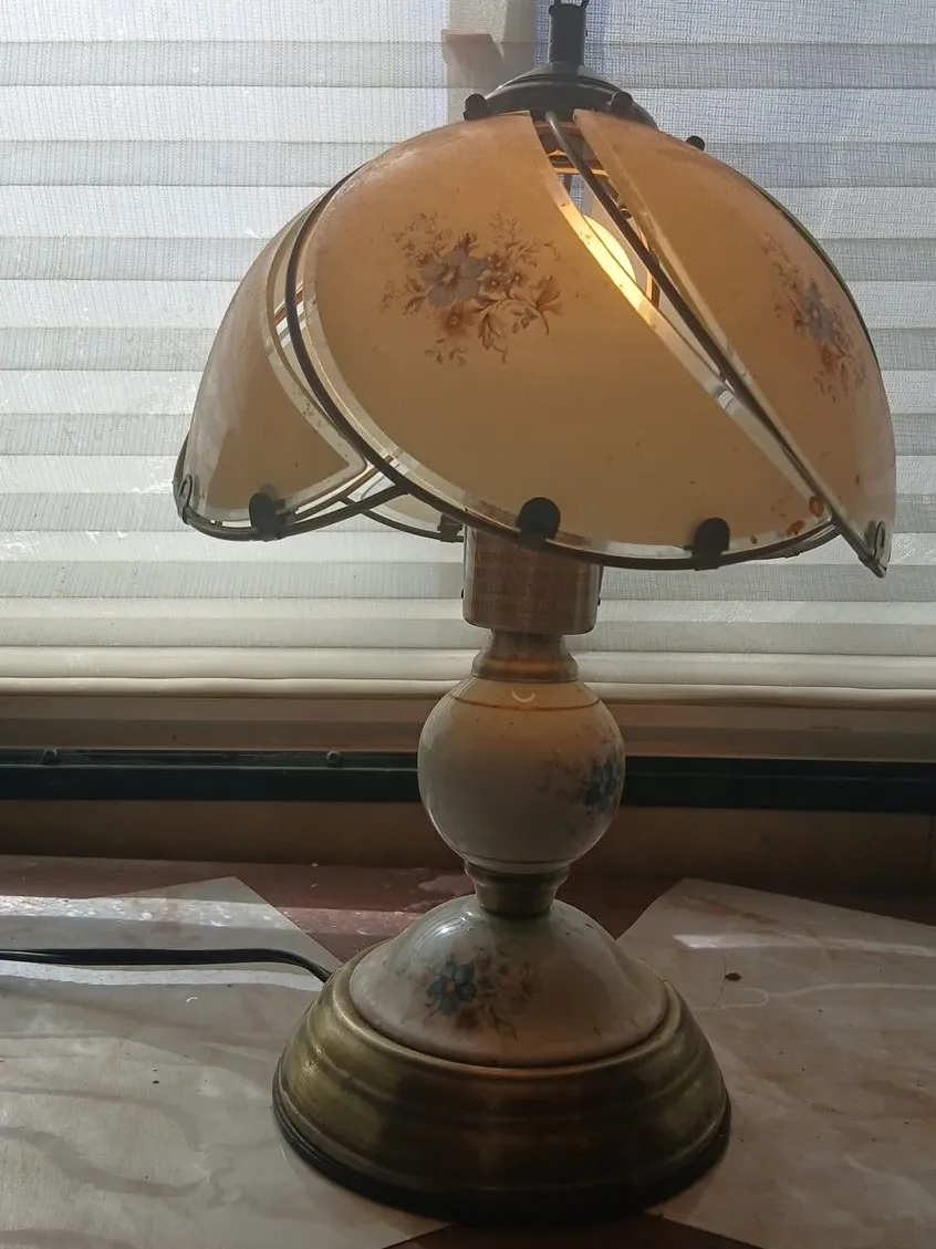 This is a vintage table lamp with a decorative floral design. It features a cream-coloured shade with blue and brown floral accents and a ceramic base with a brass-toned trim. It's an eye-catching piece for any room!