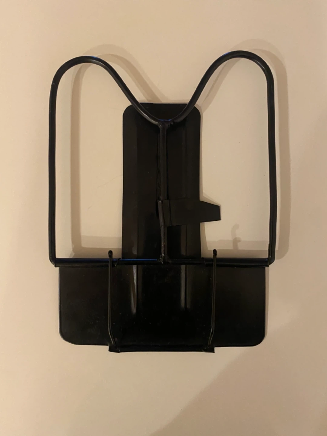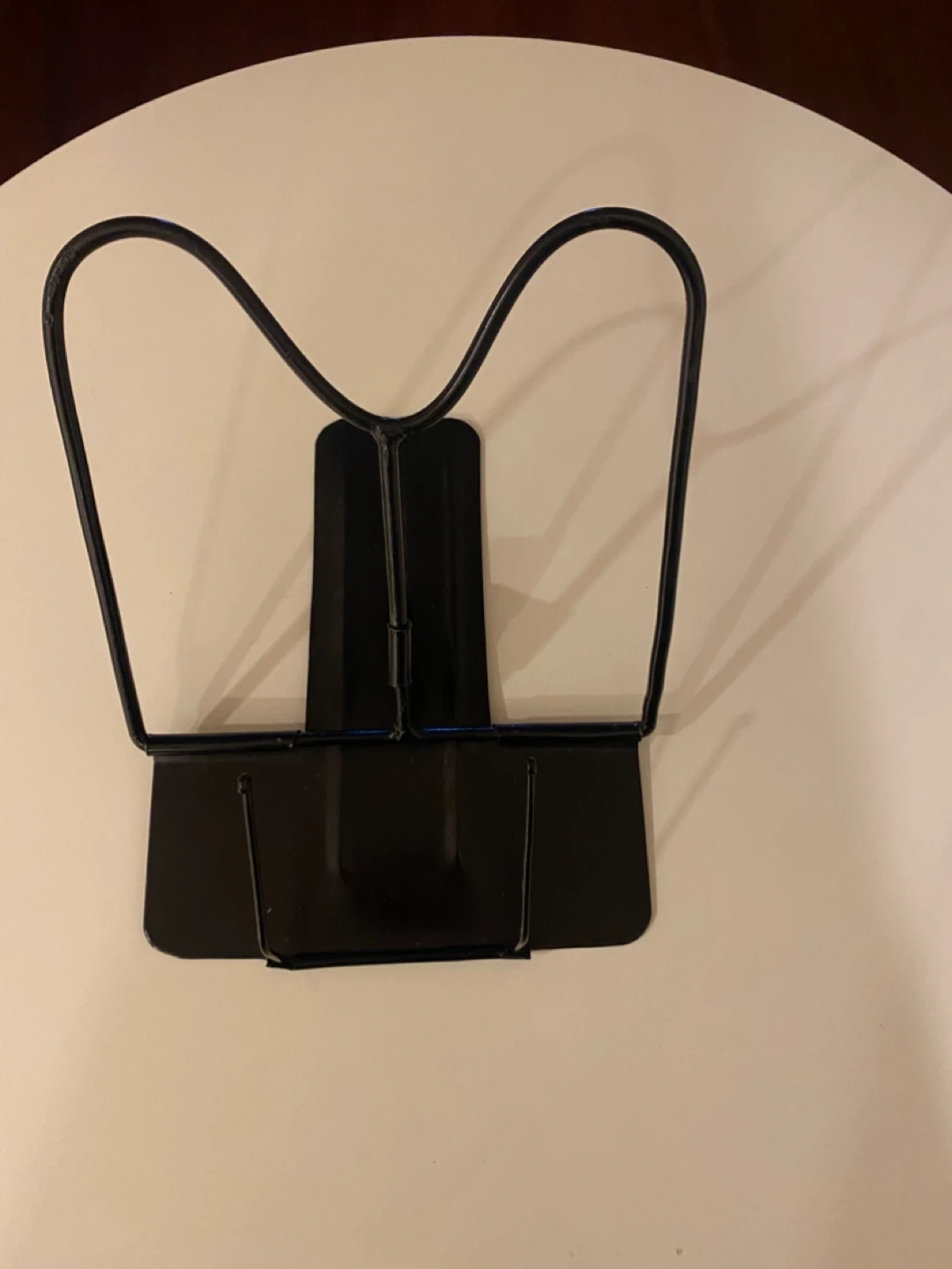 This is a black metal book stand that's perfect for displaying books. It's made of durable metal and has a sleek design. It's ideal for holding your favourite reads on a shelf or desk.