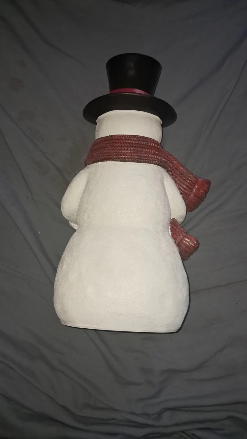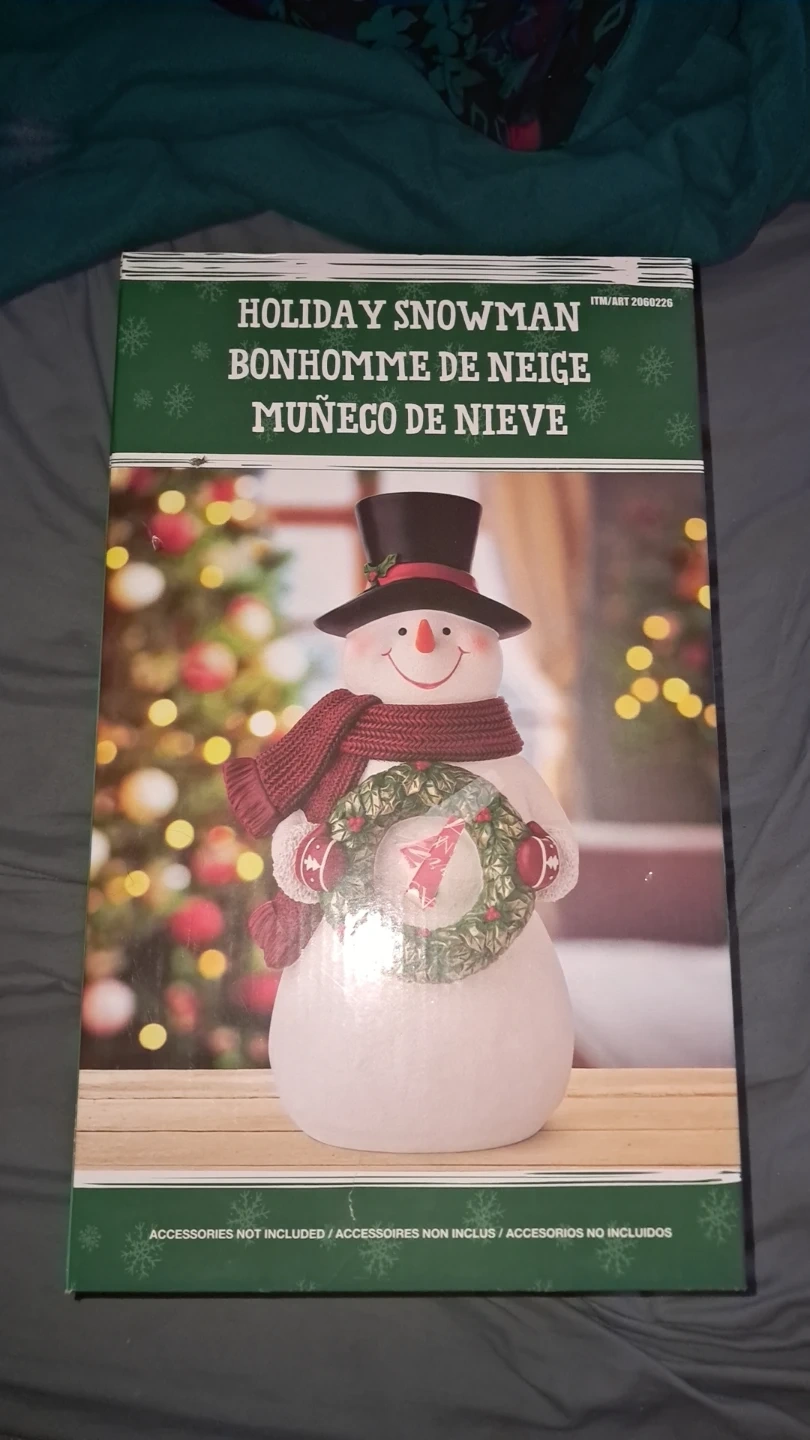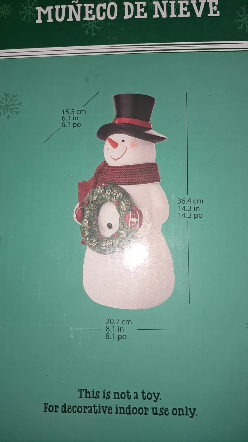 This festive holiday snowman decoration stands 14.3 inches tall. It's 8.1 inches wide and 6.1 inches deep. Made for indoor decorative use only and aside from the photos has never been taken out of the box and is in perfect condition.