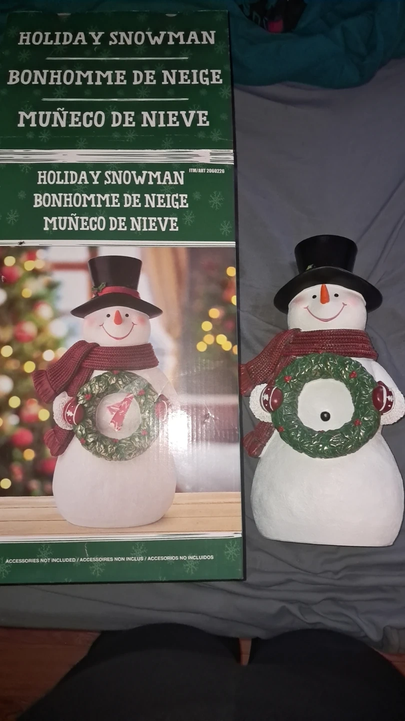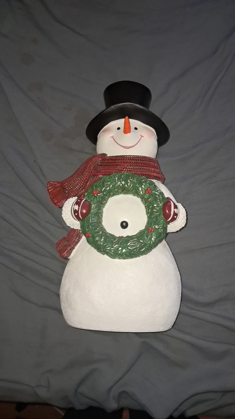 This festive holiday snowman decoration stands 14.3 inches tall. It's 8.1 inches wide and 6.1 inches deep. Made for indoor decorative use only and aside from the photos has never been taken out of the box and is in perfect condition.
