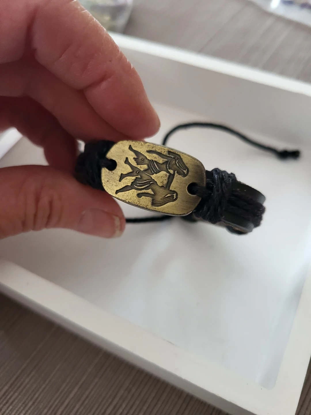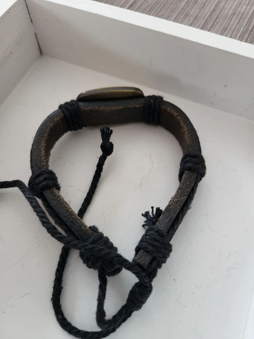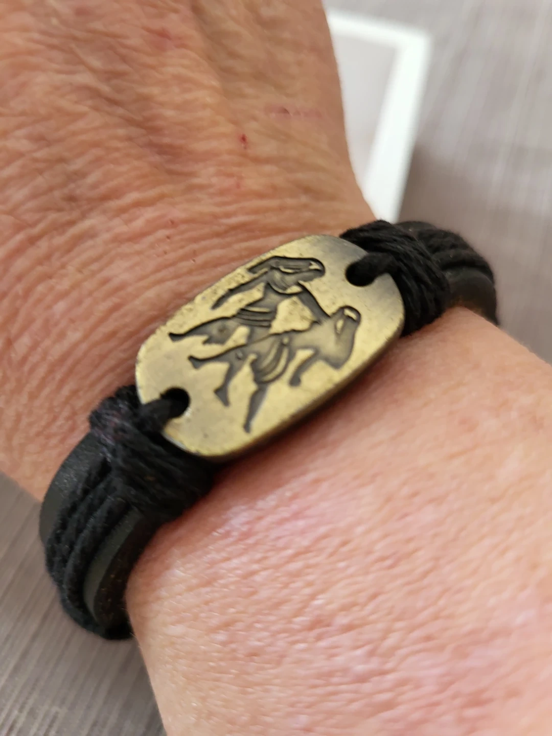 This bracelet features a brass-toned oval charm with the Gemini zodiac symbol etched into it. It's constructed with braided black leather and cord. The charm is mounted onto the leather band with black string. A great accessory for Gemini season!