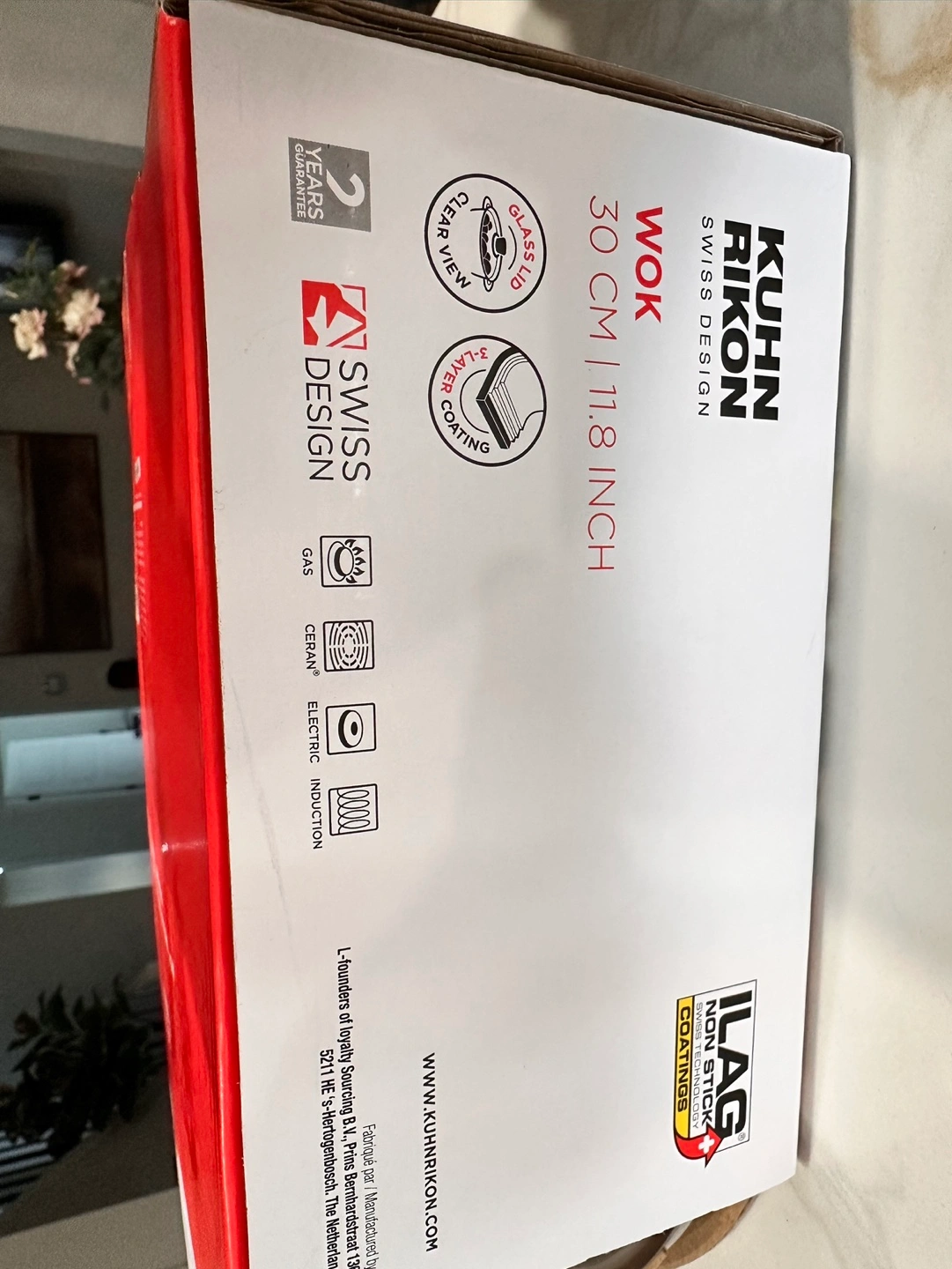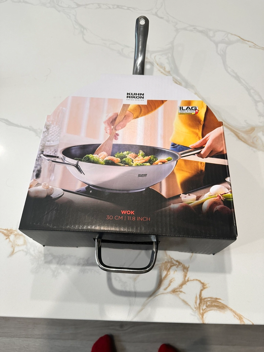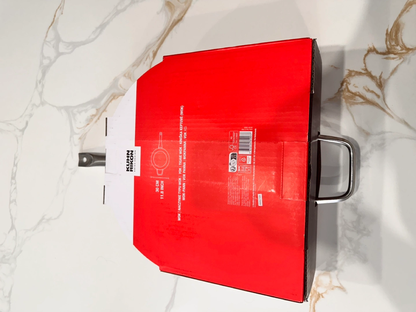 New in box. Stainless steel wok. Non-stick coating. Suitable for gas, ceramic, electric and induction cooktops. Includes a sturdy handle.