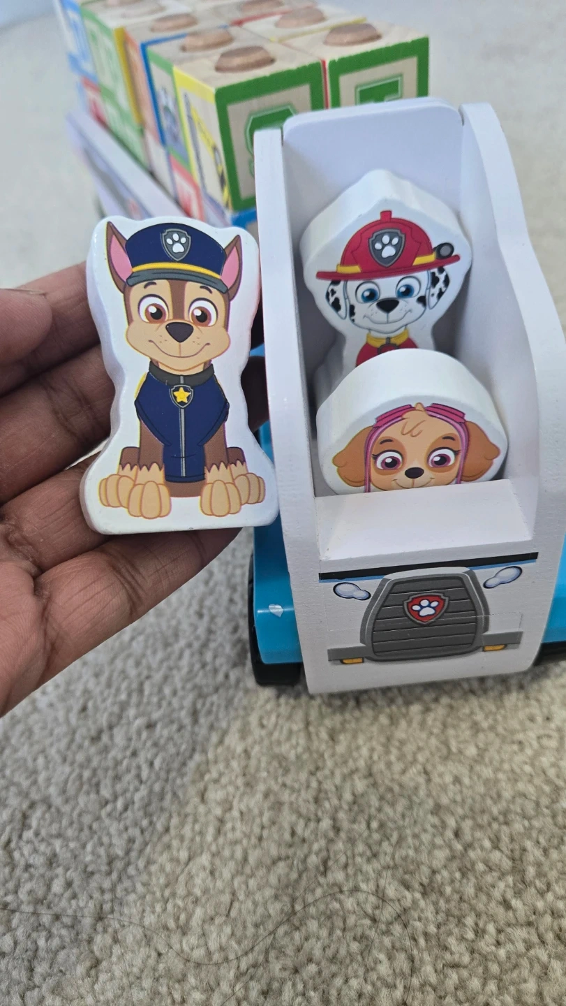 This Paw Patrol wooden truck comes with alphabet and picture blocks. It features Chase, Marshall, and Skye figures. A fun toy for little ones!