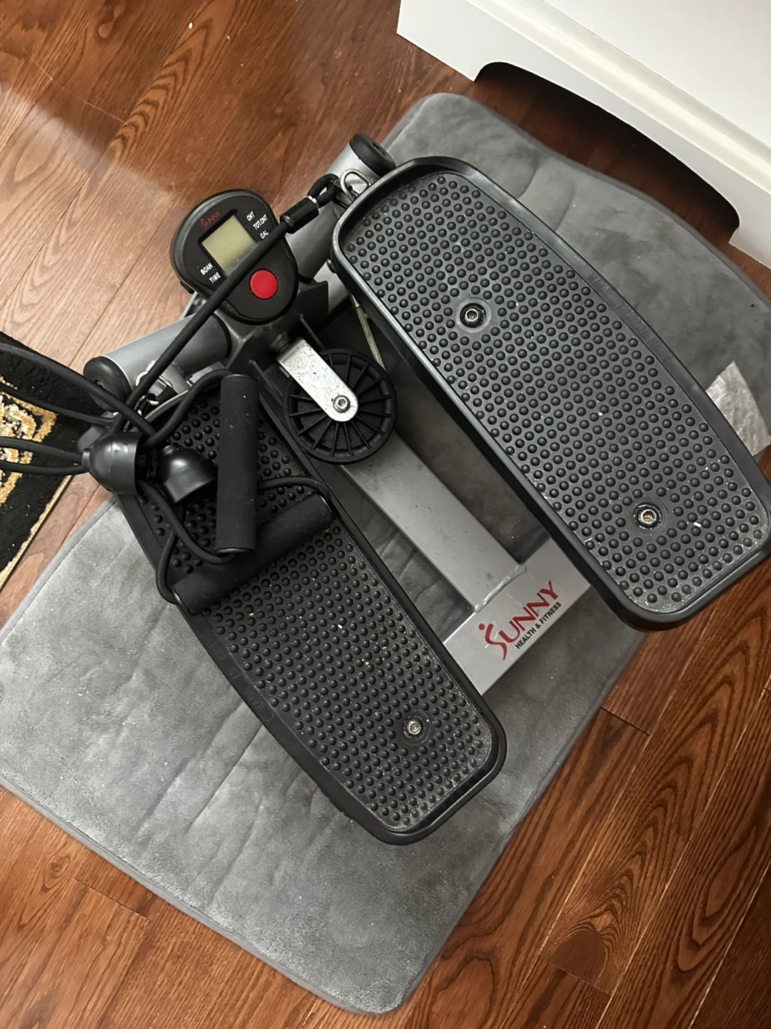 This is a Sunny Health & Fitness stepper with resistance bands. It's great for at-home cardio workouts. The digital display tracks your progress.