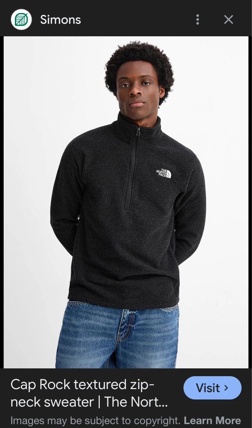 This is a men's The North Face Cap Rock textured zip-neck sweater. It's a dark charcoal colour. It's made of fleece material for warmth. This sweater is great for layering or wearing on its own during cooler weather.