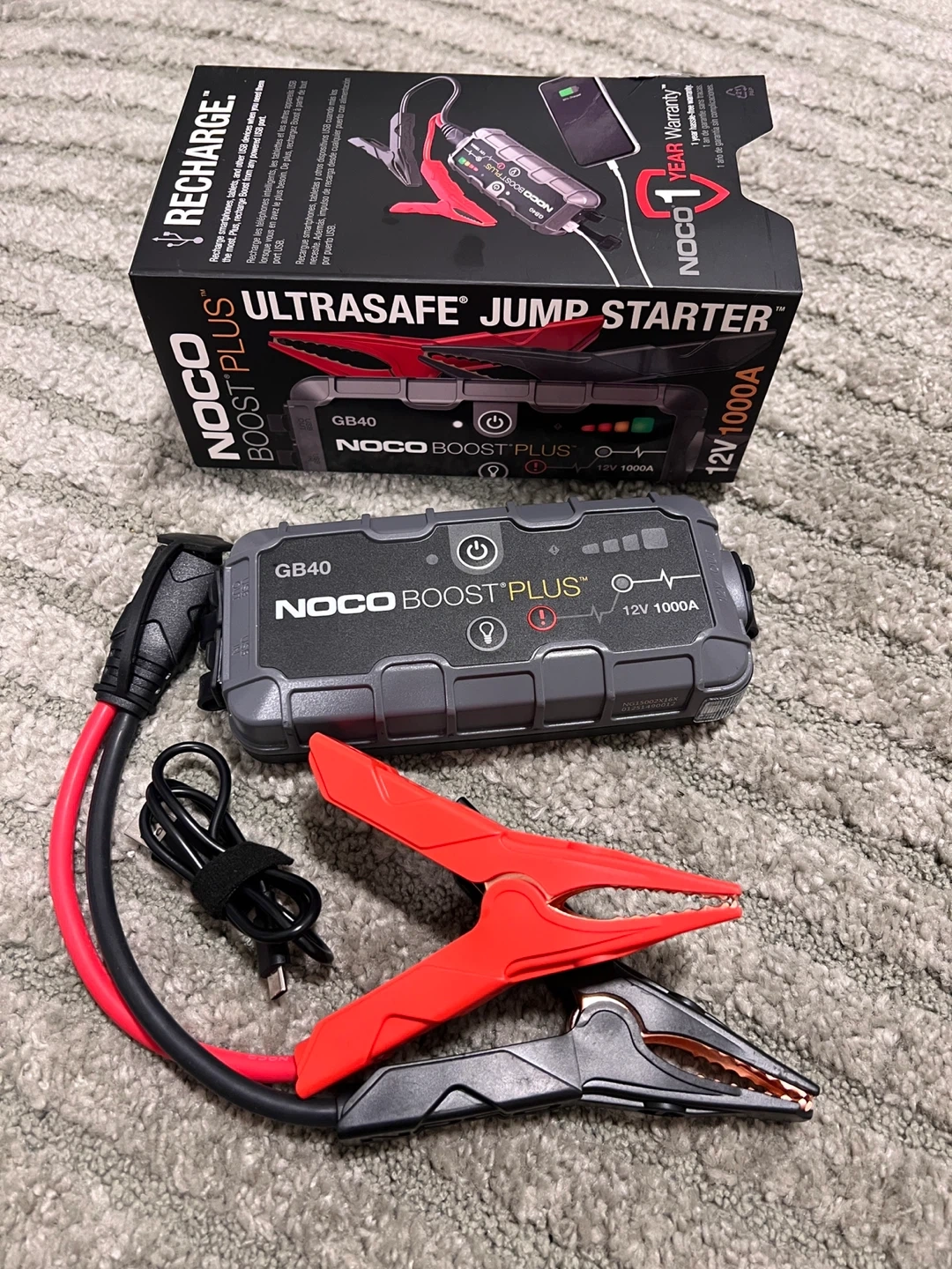 Selling a NOCO Boost Plus GB40 UltraSafe Jump Starter! This portable lithium car battery jump starter pack delivers 1000 amps (12V) for safely jump starting a dead battery in seconds - up to 20 jump starts on a single charge.