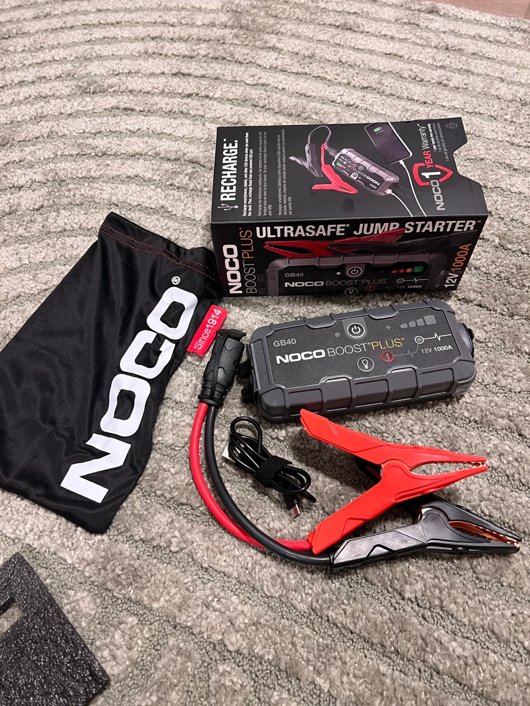 Selling a NOCO Boost Plus GB40 UltraSafe Jump Starter! This portable lithium car battery jump starter pack delivers 1000 amps (12V) for safely jump starting a dead battery in seconds - up to 20 jump starts on a single charge.