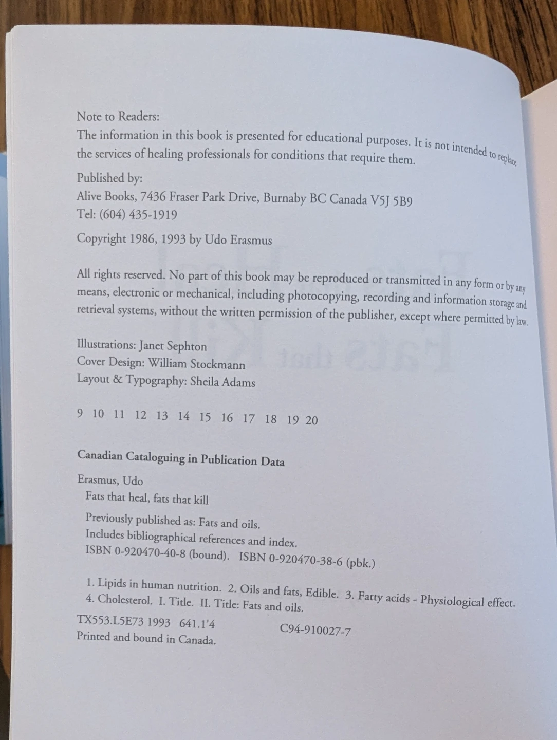 Authoritative book by Udo Erasmus on fats and oils, exploring their impact on health. Originally published in 1986, this ninth printing details how eating the right fats and oils improves energy, athletic performance, and more. Covers topics like fatty acid composition and the business of fats and oils. It includes bibliographical references and an index.