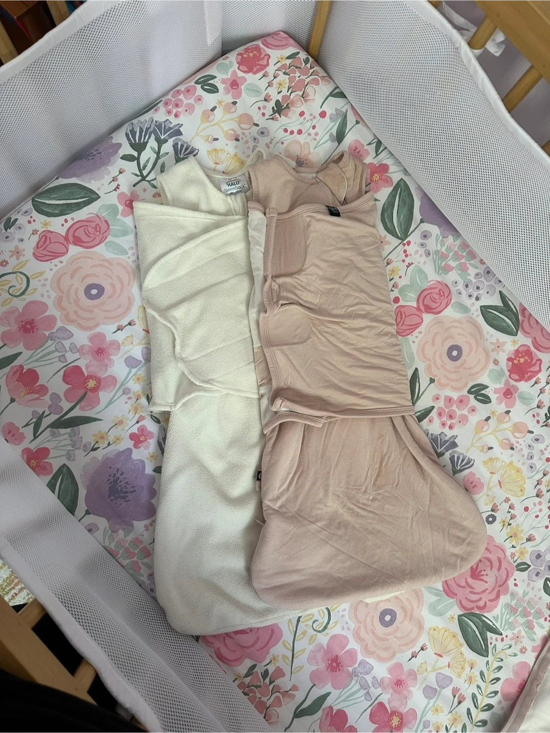 Two baby sleep sacks for a comfy and secure sleep. Includes a pink Kytd SleepSack Swaddle and a cream muslin swaddle blanket. Perfect for keeping your little one snug all night long!