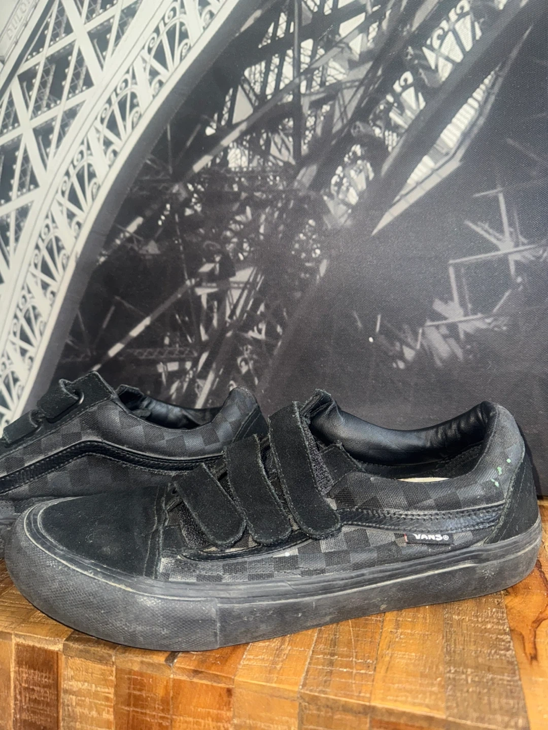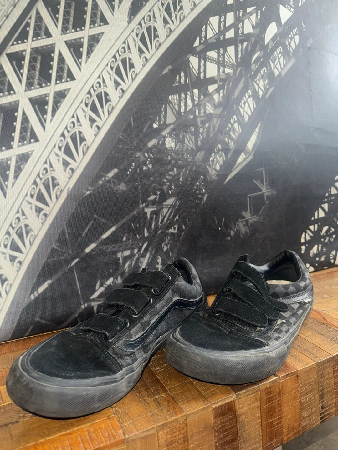 Black Vans checkerboard pattern skate shoes with velcro closures. These low-top sneakers are made for easy on and off. They're comfortable and stylish for everyday wear. A classic Vans design.