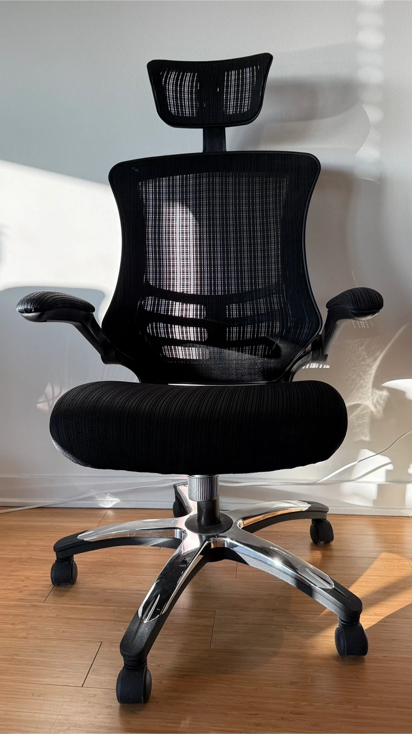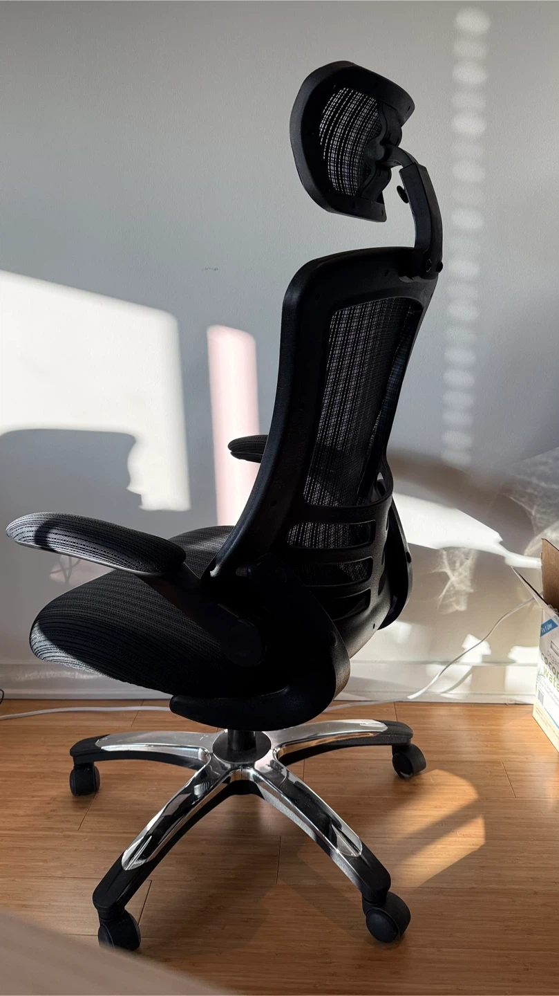 This is a black ergonomic mesh task office chair. It features a breathable mesh back and a comfortable padded seat. The chair has adjustable armrests and a headrest for added support. It's on a five-star base with casters for easy mobility.
