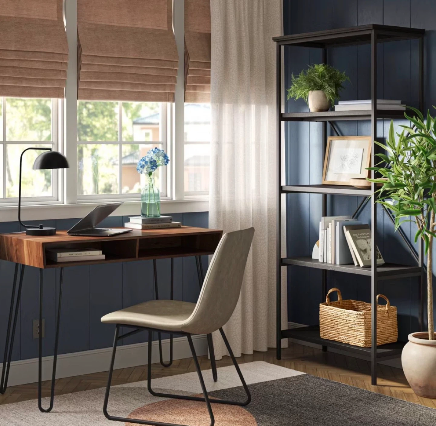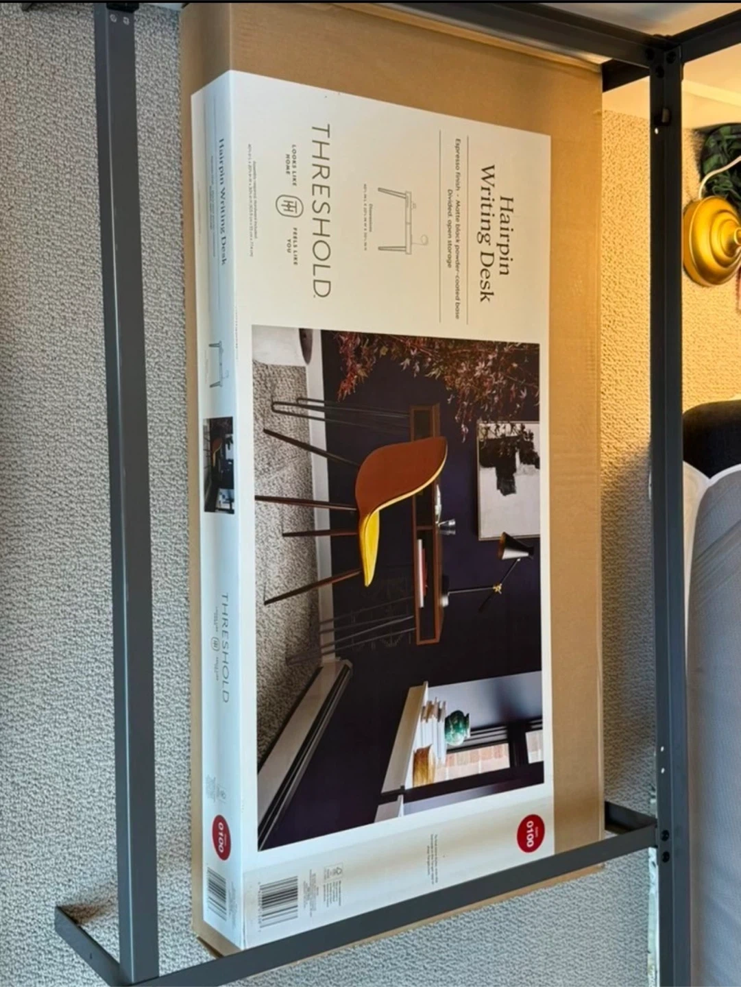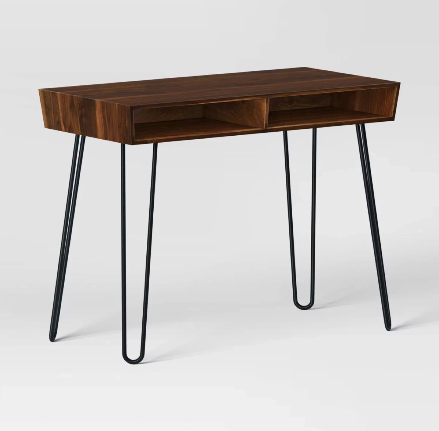 Brand-new modern writing desk, never used, still sealed in original box. Walnut finish with black metal hairpin legs and two open storage compartments. Perfect for home office, study, apartment, or dorm.