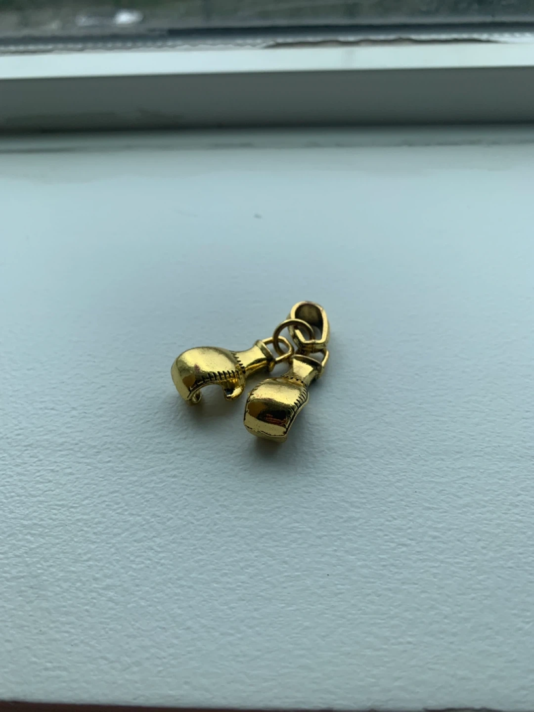 This is a gold-tone charm shaped like a pair of boxing gloves. It has a small loop for attaching to a bracelet or necklace. Adds a sporty touch to any jewellery!