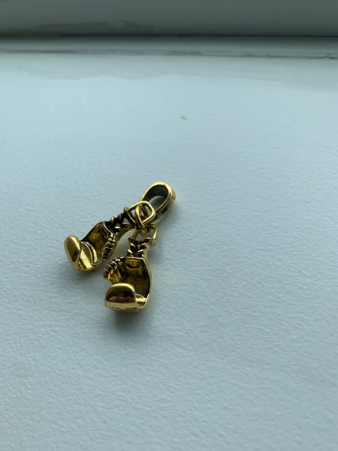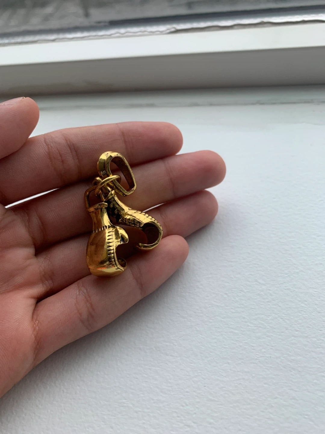 This is a gold-tone charm shaped like a pair of boxing gloves. It has a small loop for attaching to a bracelet or necklace. Adds a sporty touch to any jewellery!