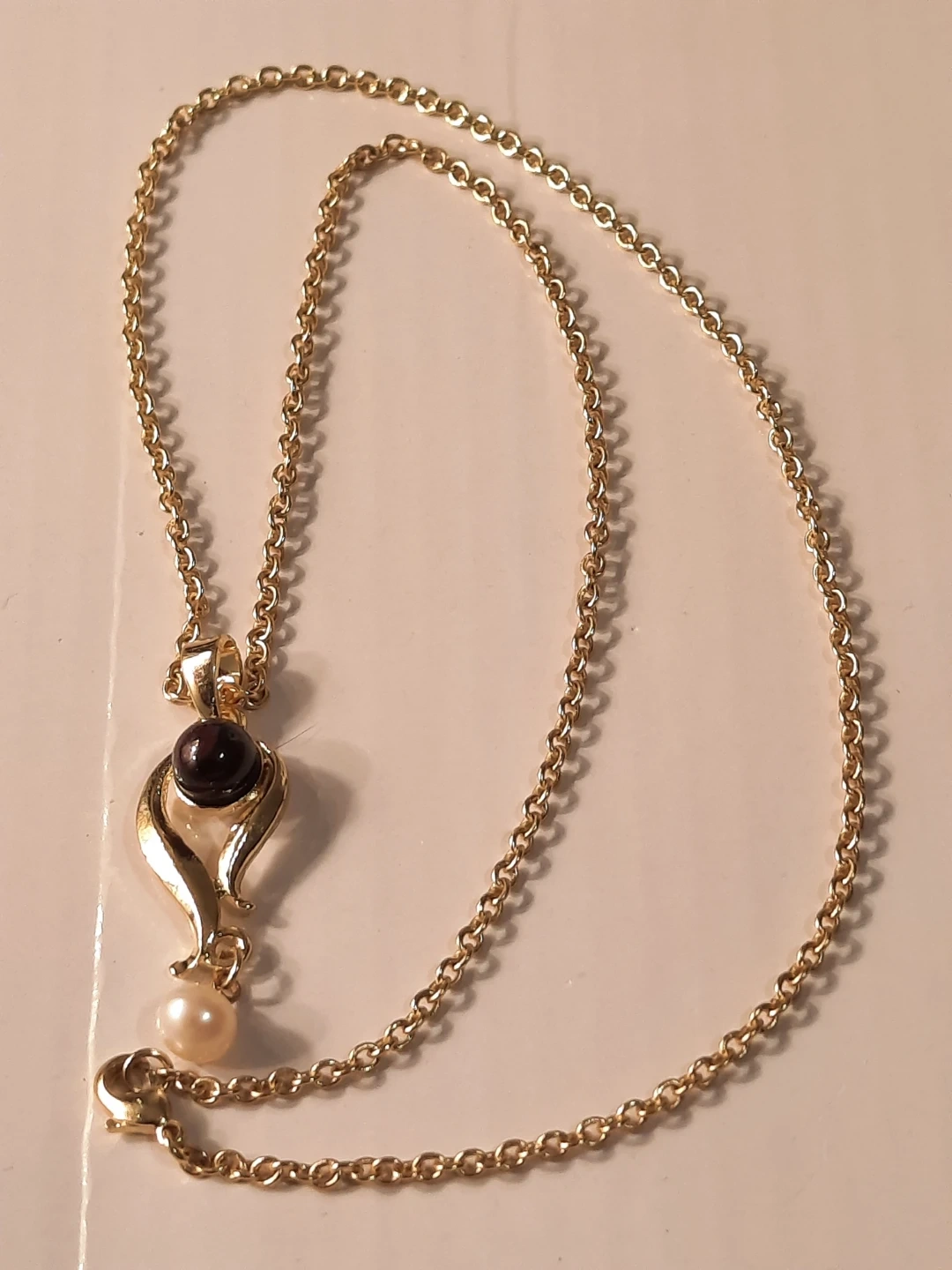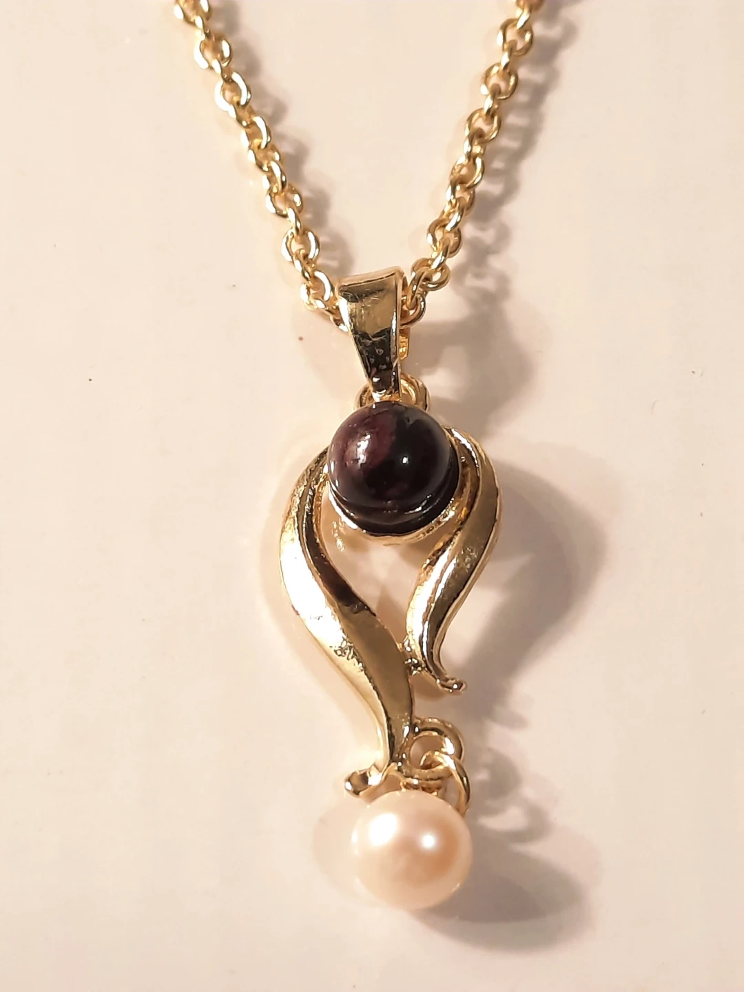 This 14K gold filled pendant necklace features a deep dark stone and a creamy real pearl. The chain is a classic link style. This piece would make a lovely addition to any jewellery collection.not solid.,new not used.