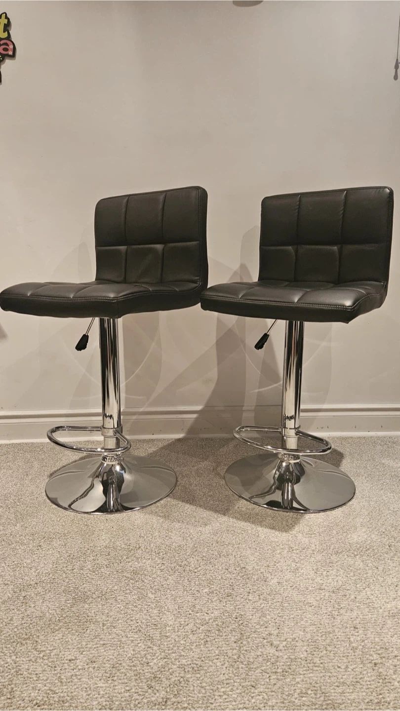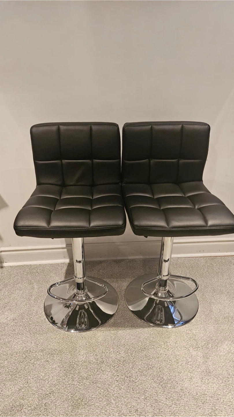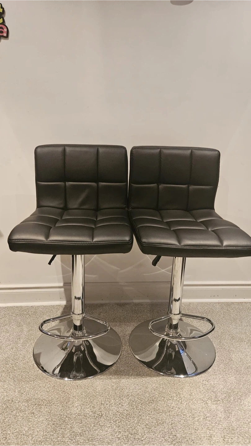 Selling a set of two black bar stools. They have adjustable heights with a chrome base and footrest. The seats are upholstered in what looks like faux leather.