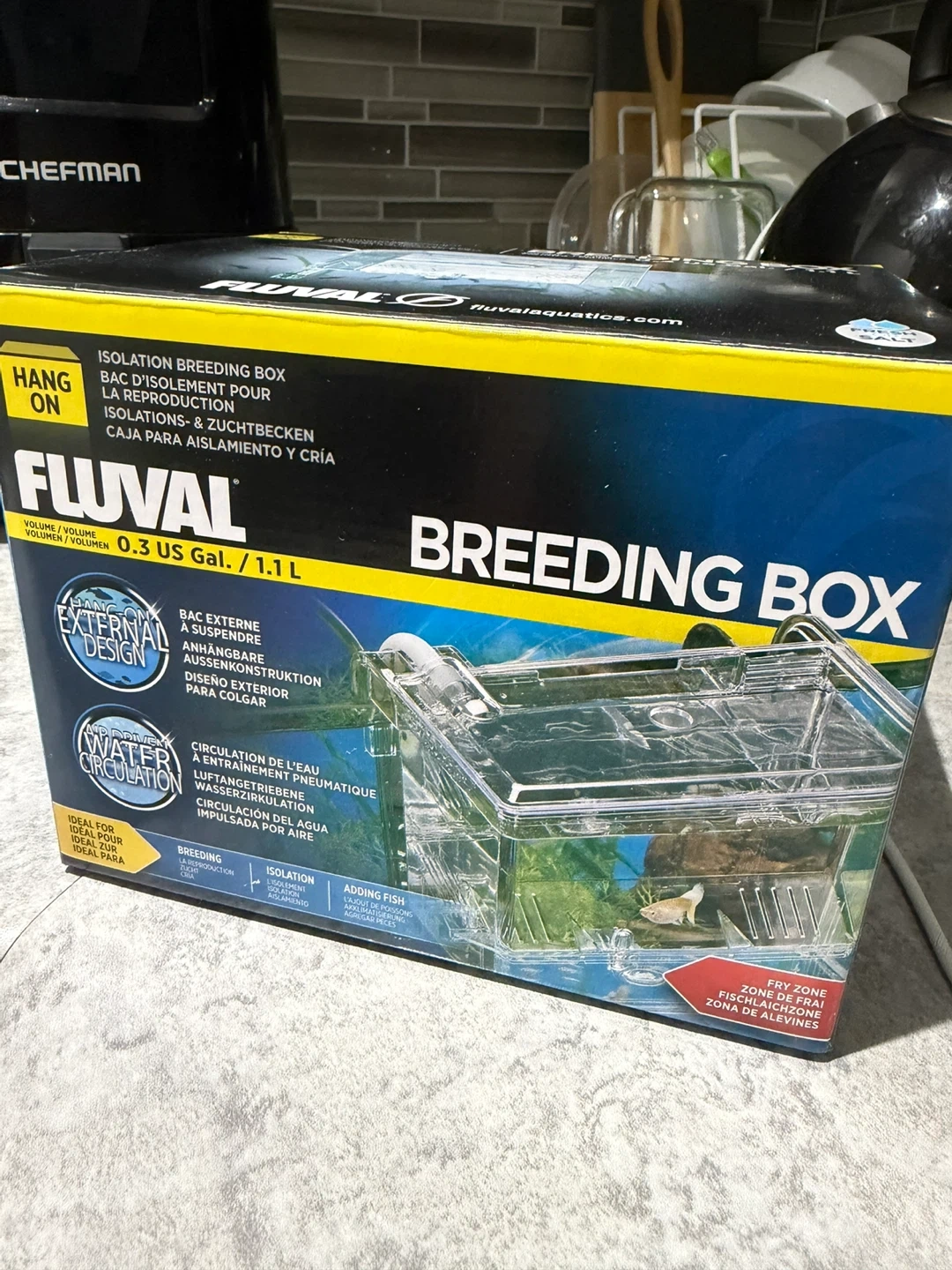 This Fluval "Hang On" breeding box is designed for isolation and reproduction. It's made of clear plastic and features external design for easy water circulation. This aquarium accessory is ideal for separating fish.