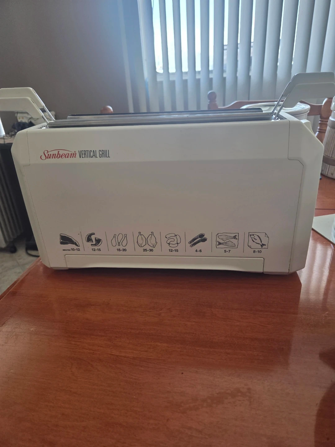 This is a Sunbeam Vertical Grill. It's great for cooking various foods vertically, offering even cooking. Includes a wire rack for placement. Easy to clean. Drip tray. We used it mostly to cook meats (steak, porkchops, boneless chicken breasts)