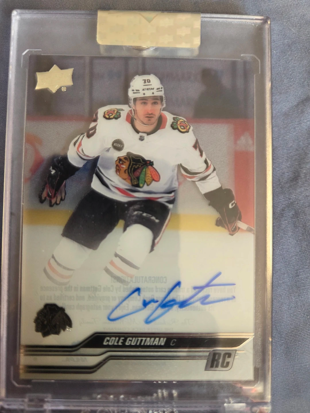 This is a 2023-24 Upper Deck Clear Cut Hockey trading card. It's autographed by Cole Guttman. The card is certified as authentic by The Upper Deck Company. This card would be great for any Blackhawks fan or hockey card collector!