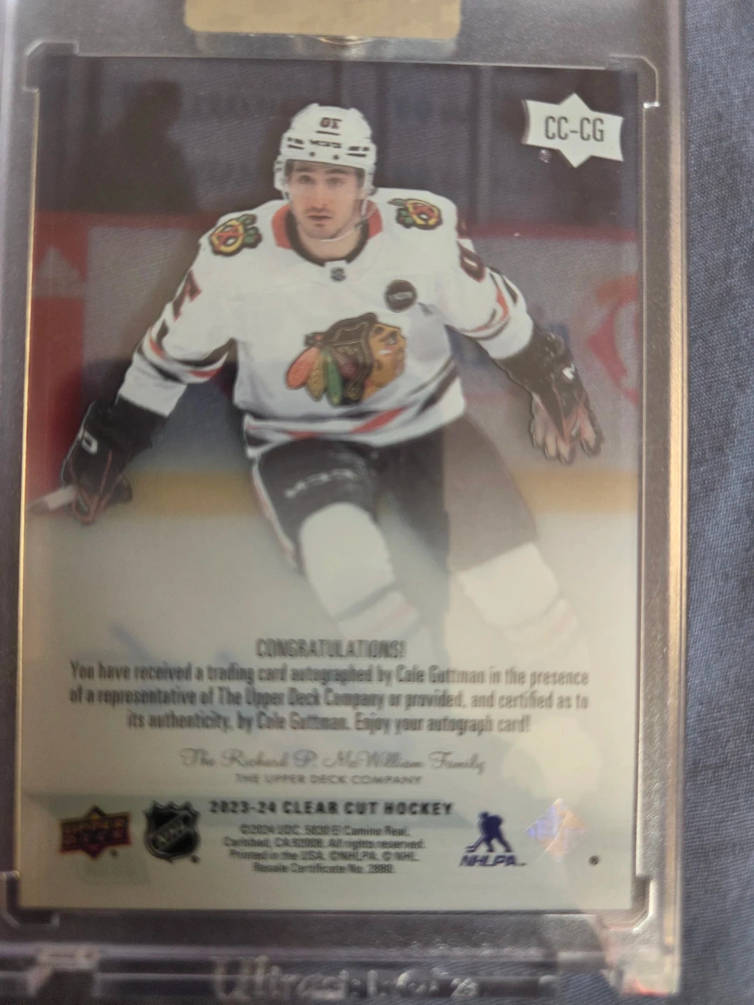 This is a 2023-24 Upper Deck Clear Cut Hockey trading card. It's autographed by Cole Guttman. The card is certified as authentic by The Upper Deck Company. This card would be great for any Blackhawks fan or hockey card collector!