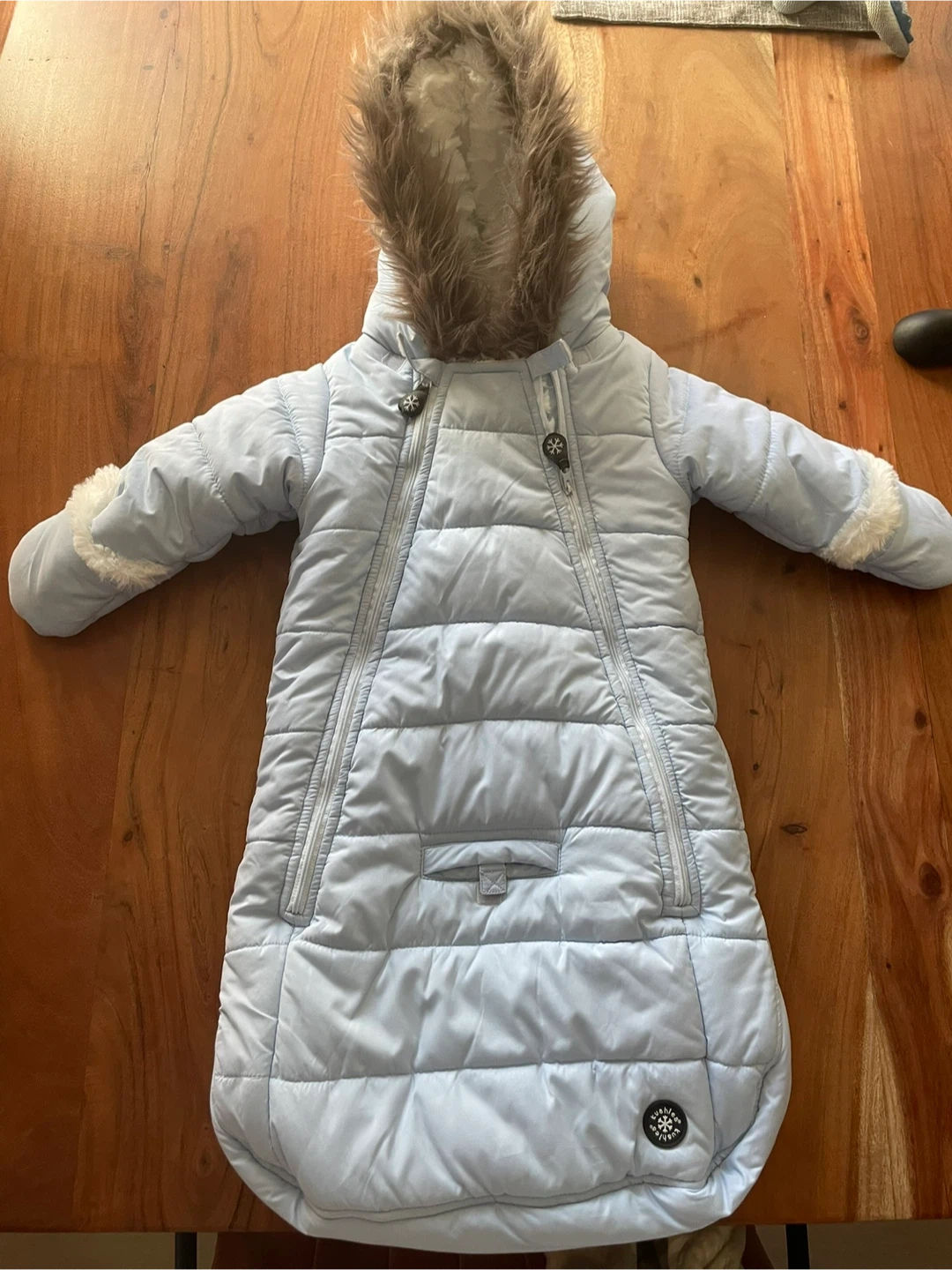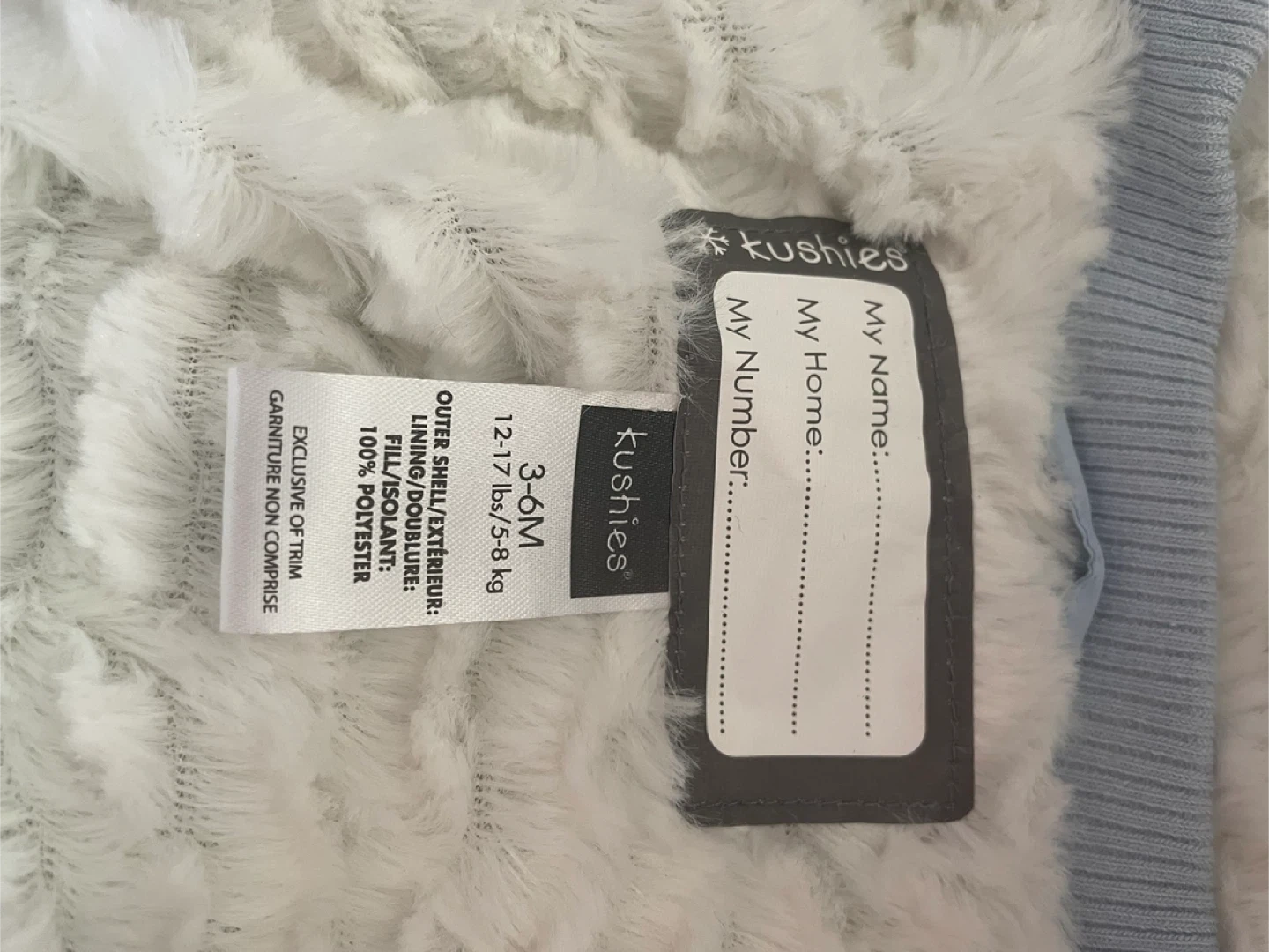 120Keep your little one warm with this adorable Kushies snowsuit! It's a lovely light blue colour and features a super soft, plush lining. Great for layering and keeps feet extra warm. Perfect for babies aged 3-6 months (12-17 lbs/5-8 kg). The outer shell and lining are both 100% polyester, making it easy to care for. Perfect for walks outside as you have access for stroller straps. My little outgrew before we really needed it - so it is essentially new - worn once at Zoolights so we know itโs warm ๐