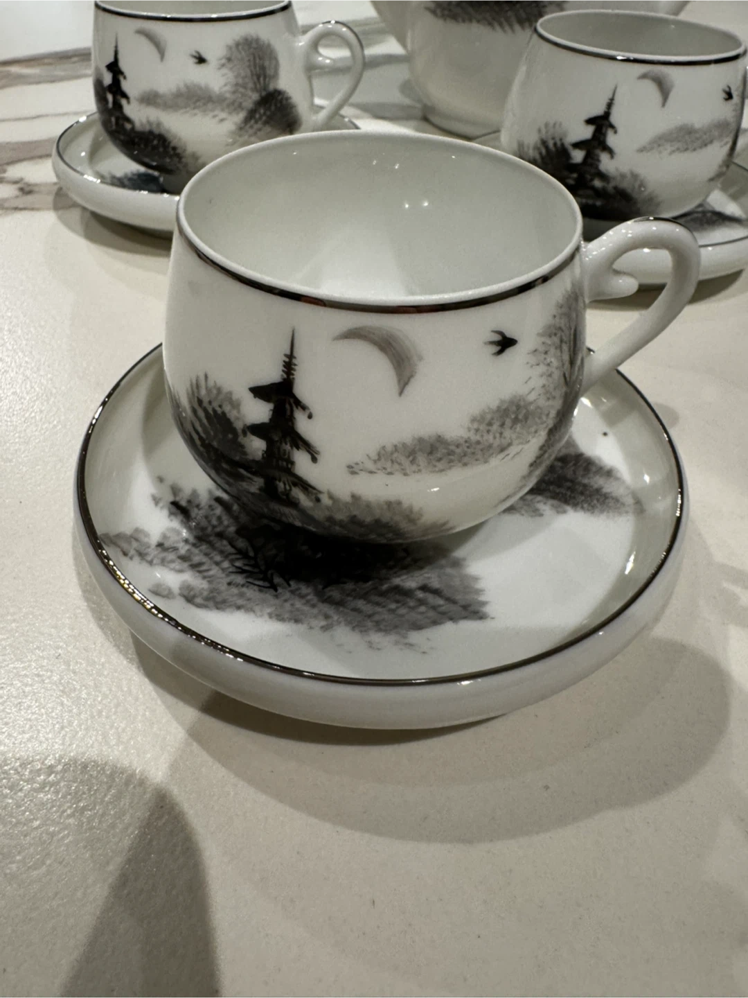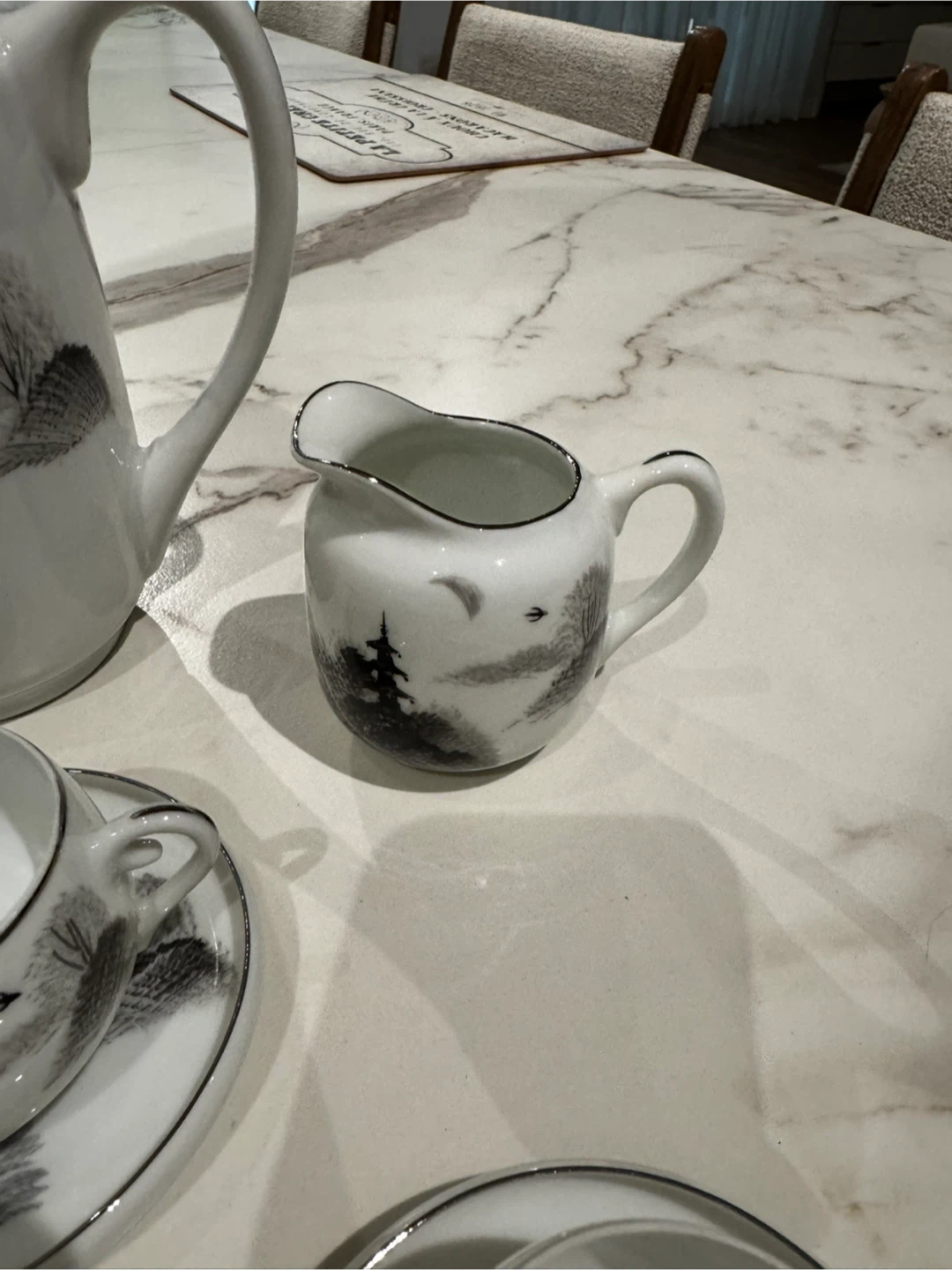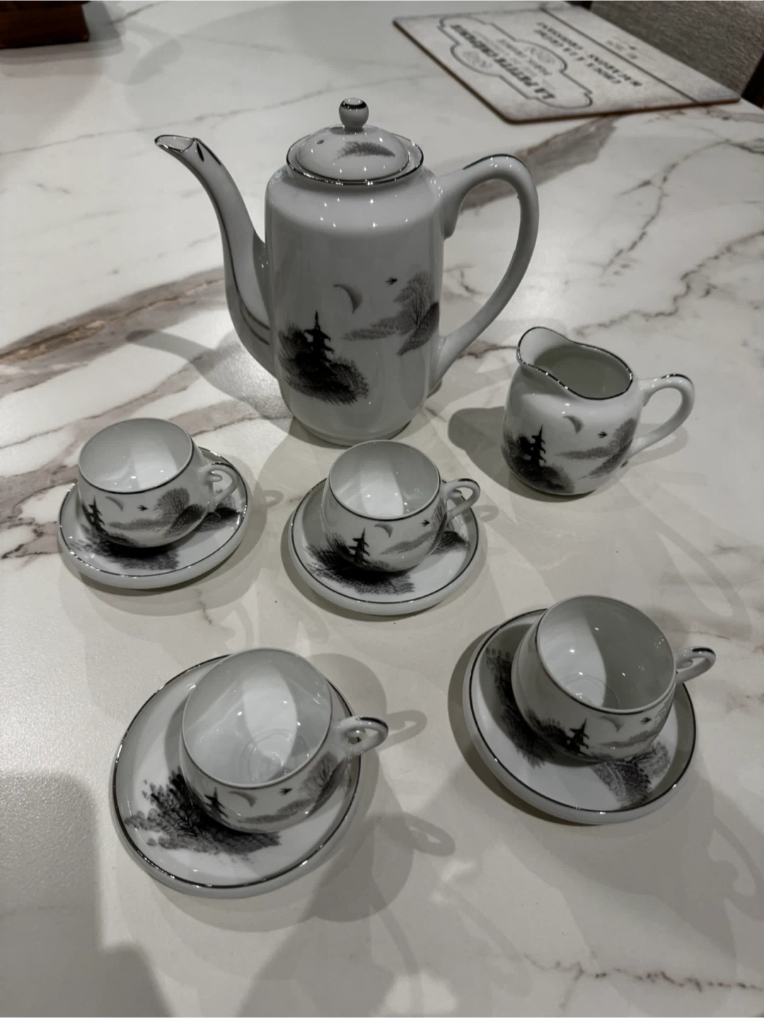 Beautiful Kutani China tea set featuring a teapot, creamer, and four cups with saucers. The set is white with a delicate black and grey landscape design. Perfect for tea time or as a decorative piece! One small chip on teapot spout