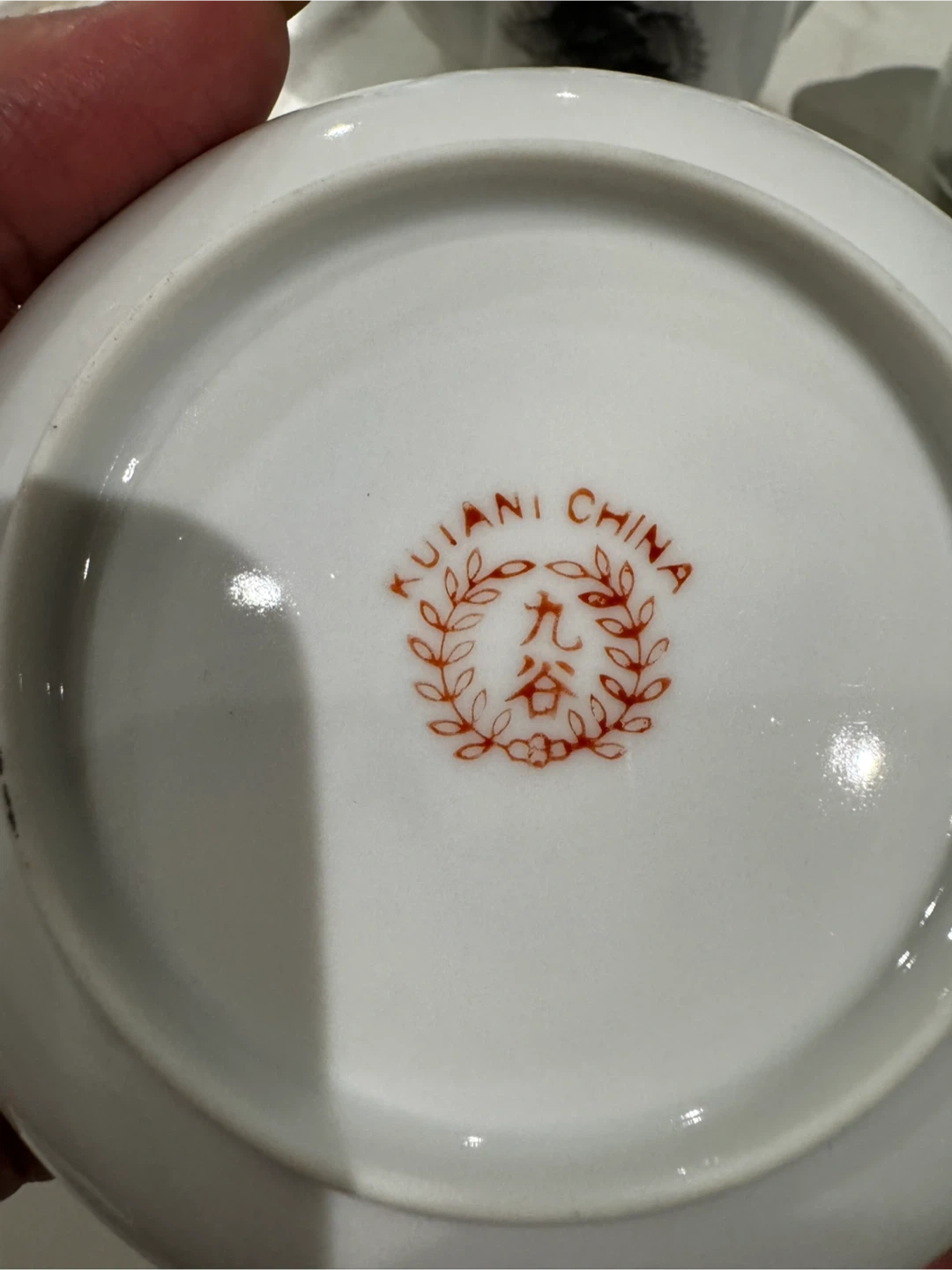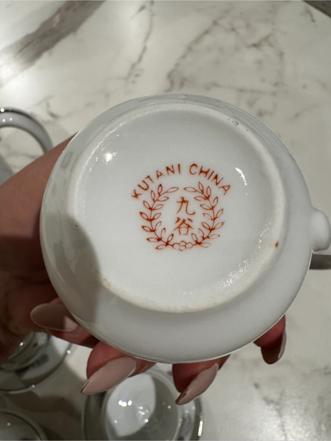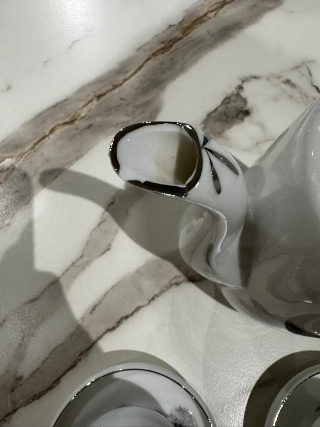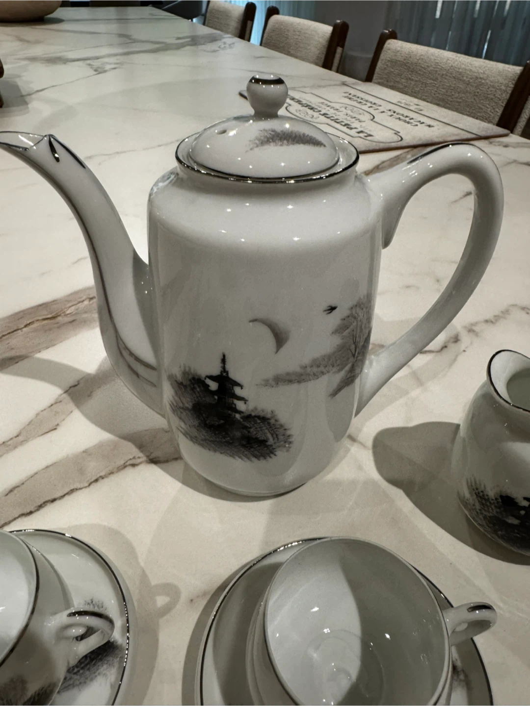 Beautiful Kutani China tea set featuring a teapot, creamer, and four cups with saucers. The set is white with a delicate black and grey landscape design. Perfect for tea time or as a decorative piece! One small chip on teapot spout