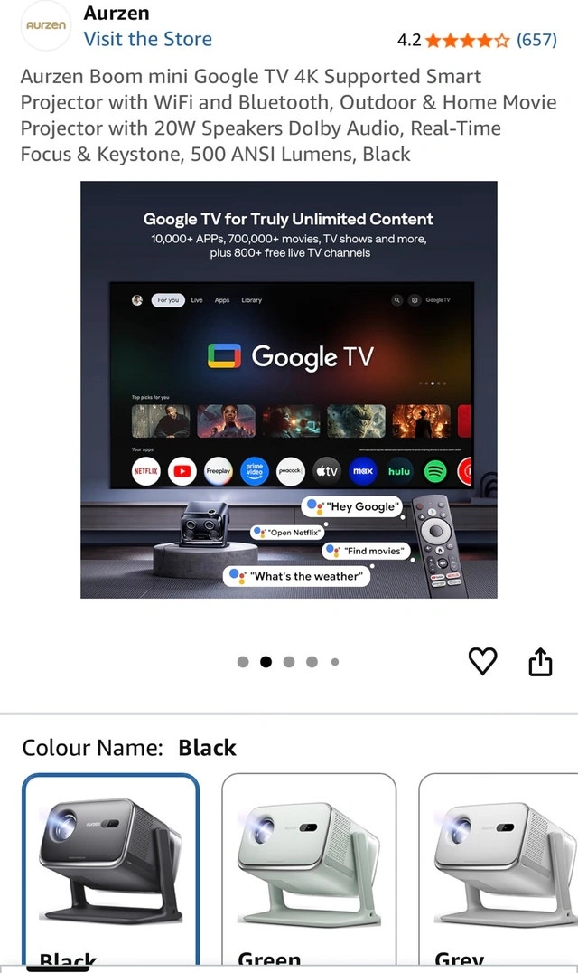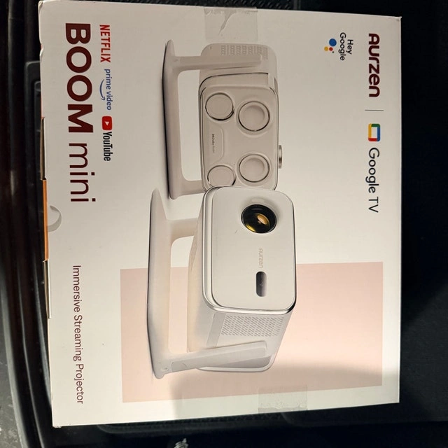 Experience immersive streaming with this Aurzen Boom mini Google TV 4K supported smart projector, featuring WiFi and Bluetooth connectivity for outdoor and home movie nights. It boasts 20W speakers with Dolby Audio and real-time focus and keystone correction, delivering a personal theatre in a box. This item is new, unused. Specifications: Google TV for Unlimited Content, Dolby Audio & DSP Tech, Real-Time Focus, 110° Visible Stand. This projector is ready to bring the magic of the cinema to your living room or backyard! The ad is still up, so this awesome projector is still available for grabs!