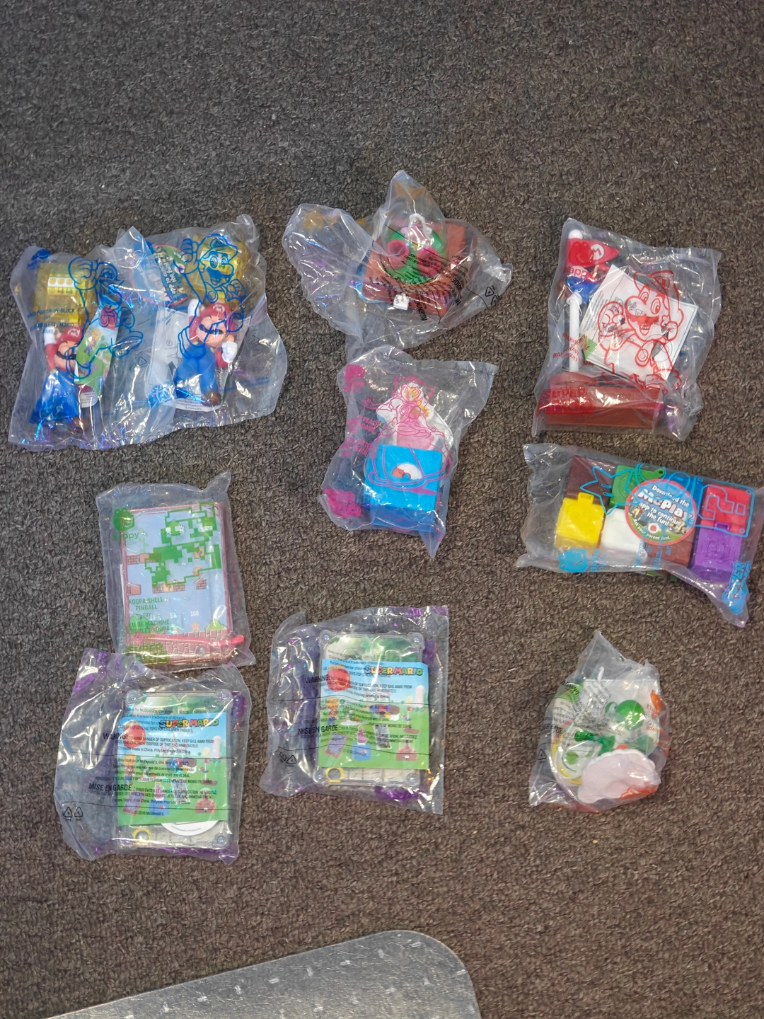 Full set of 8, still in the plastic! Comes with doubles of the pinball & mario with the mystery block.