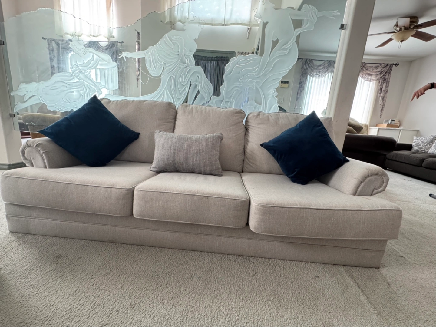 Buy & SellBeige 3-seater sofaBeige 3-seater sofa$80Beige fabric sofa, three seats. Rolled arms. Includes two dark blue and one grey throw pillows.WHERE TO MEETHouseView MapSELLERPathan MoshimNewton310 reviews7 chats·1 favorites·497 viewsSEND CHAT TO SELLERHi Pathan Moshim! I’m interested in your listing.Hi Pathan Moshim! I’m interested in your listing.Get the Karrot app to chatSign In to chat