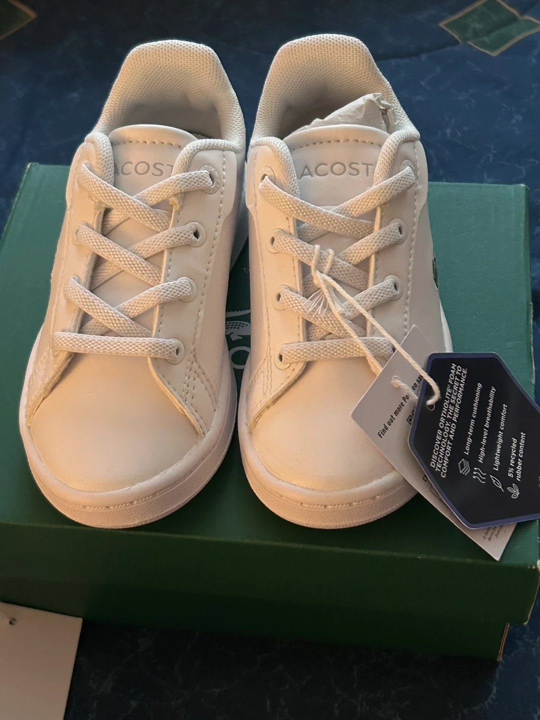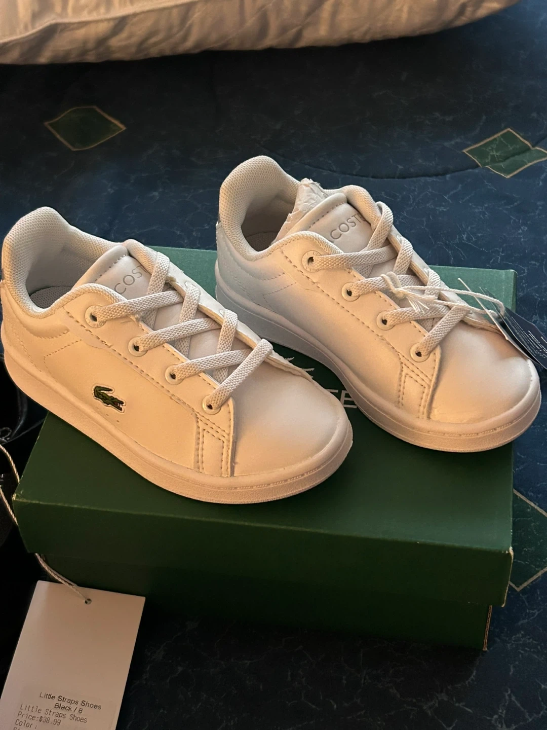 These white leather Lacoste Little Chimpion shoes are perfect for little ones. They feature a secure strap closure for easy on and off. The durable rubber sole provides good traction for active toddlers. These shoes offer comfort and style for everyday wear!