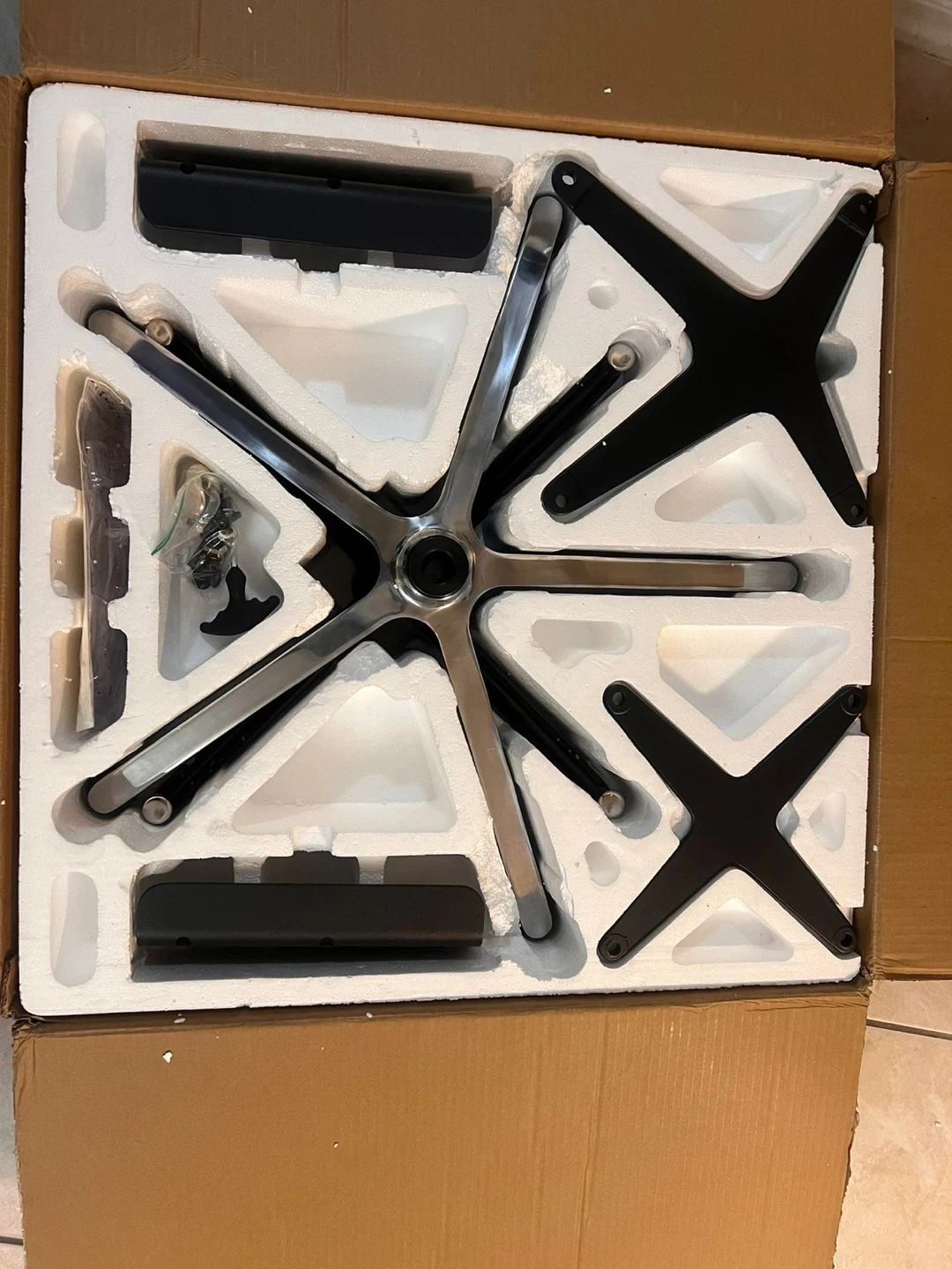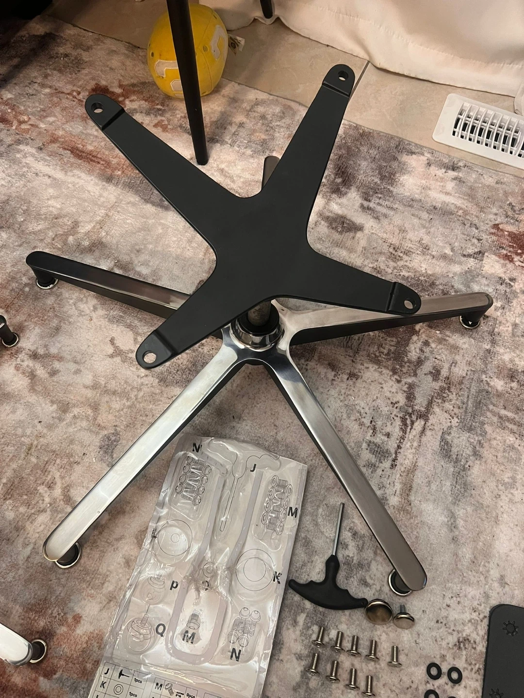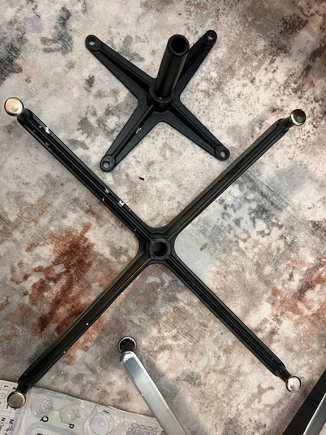 This is a set of replacement parts for an office chair base. It includes two metal star bases, along with screws and an Allen key. The parts appear to be for a standard five-star office chair design. This set is useful for repairing or upgrading an existing office chair.