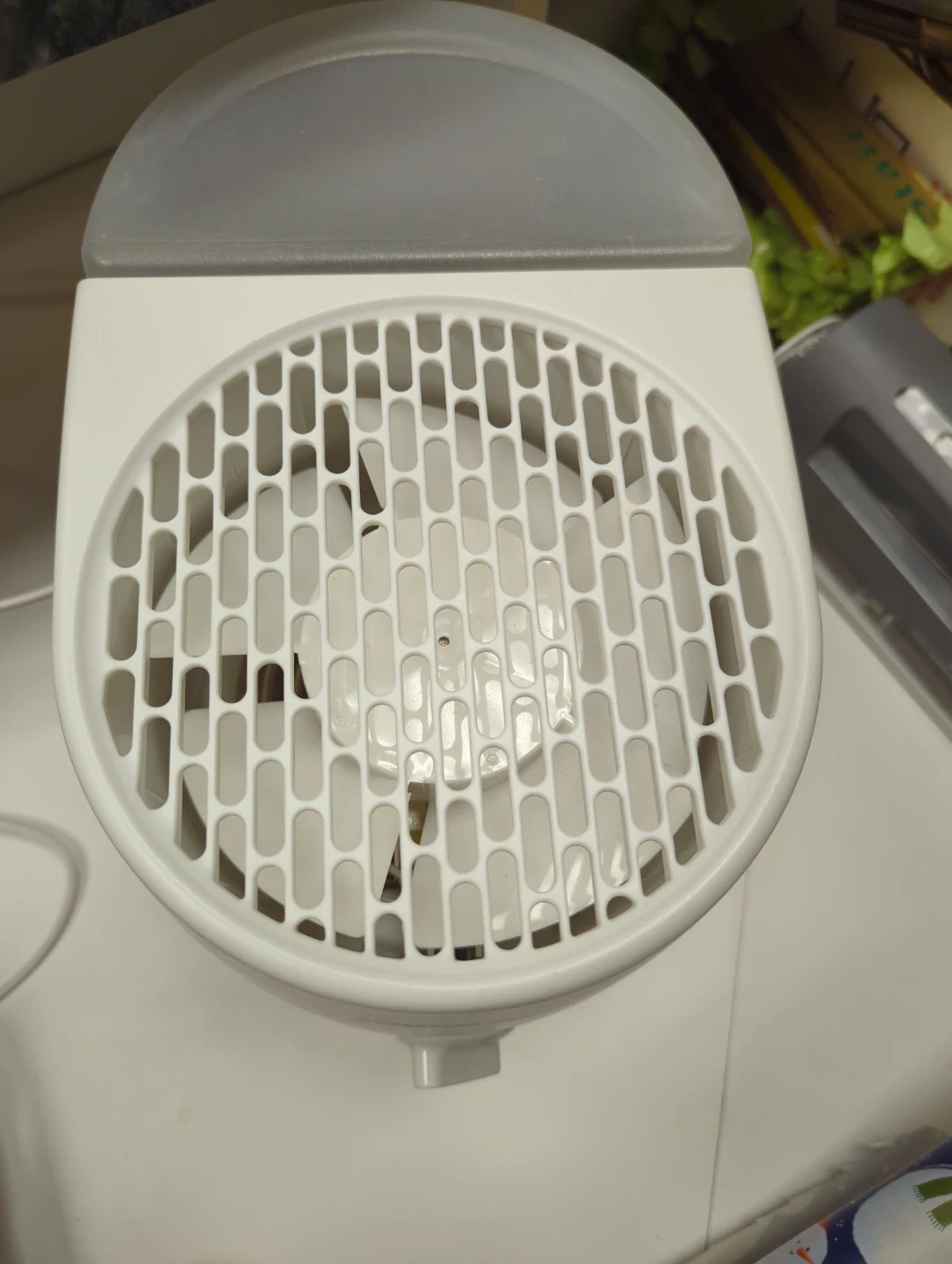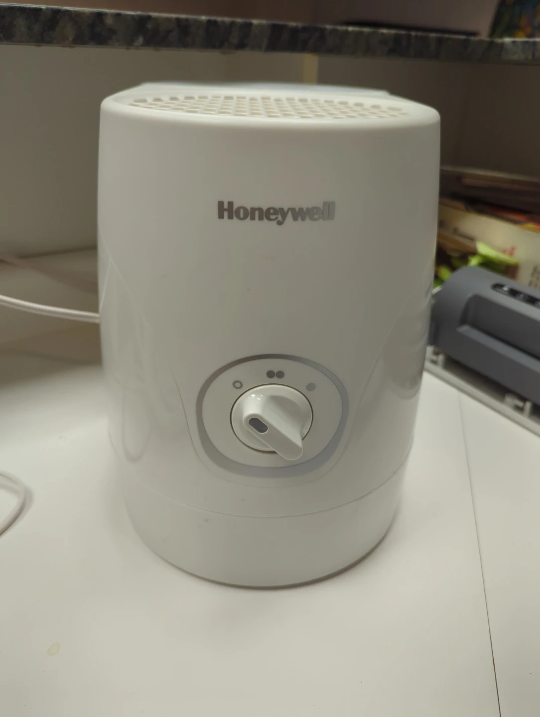 This is a white Honeywell humidifier. It has an adjustable dial for mist output. It's a compact unit suitable for smaller spaces.