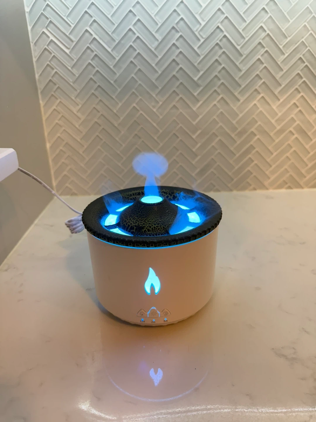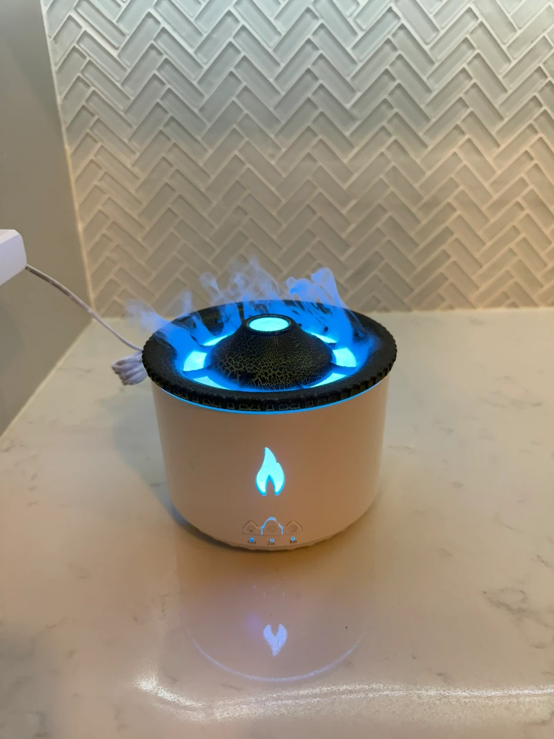 This aroma diffuser humidifier creates a realistic flame effect with its lighting and mist. It has multiple light colour options, including orange and blue. It's perfect for adding a cozy atmosphere to any room.